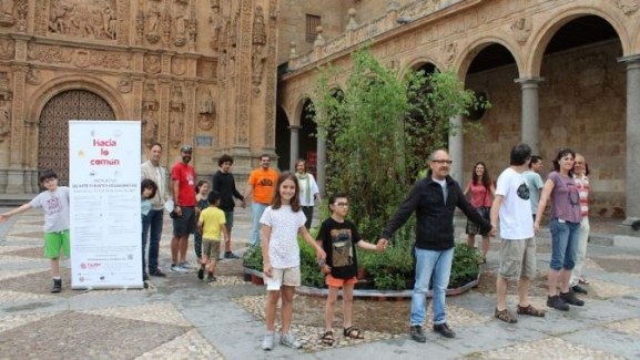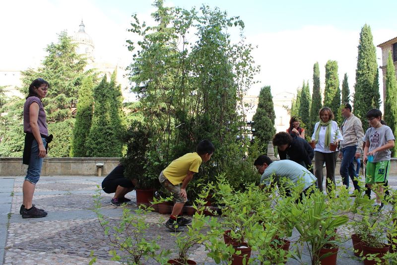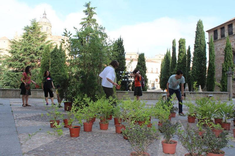 Tal y como estaba previsto, el jardín creado por Juanvi Sánchez, dentro de la exposición de arte urbano y colaborativo 'Hacia lo común' de Cáritas Diocesana de Salamanca, será trasladado desde el atrio del convento de San Esteban al Patio Chico.