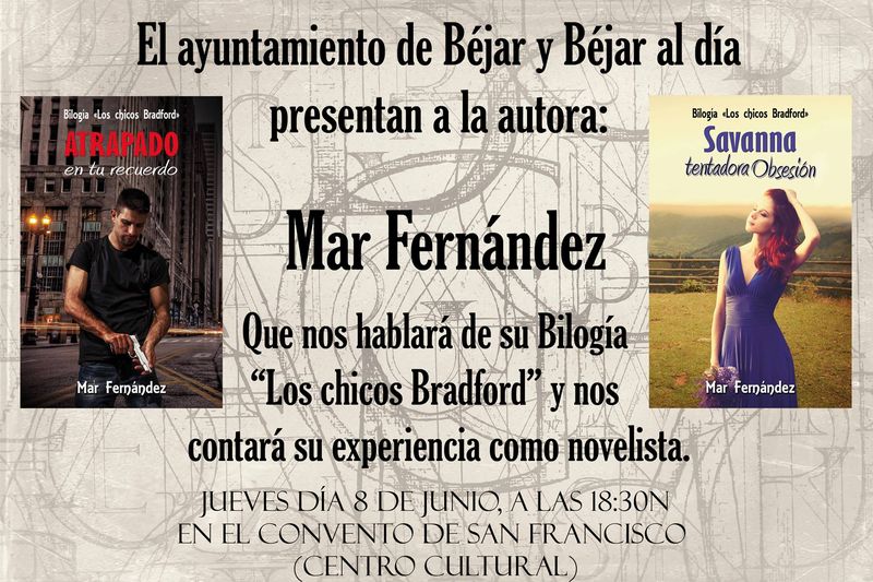 Comprometidos con la promoción de la cultura y los talentos de nuestra comunidad, el periódico Béjar al Día y el Ayuntamiento de Béjar, tienen el placer de invitarles a la presentación de la obra de la novelista Mar Fernández, una escritora de éxito afincada en Navalmoral de Béjar, que ha conseguido posicionarse como número uno en descargas de sus libros, a través de la plataforma de ventas online, Amazon.