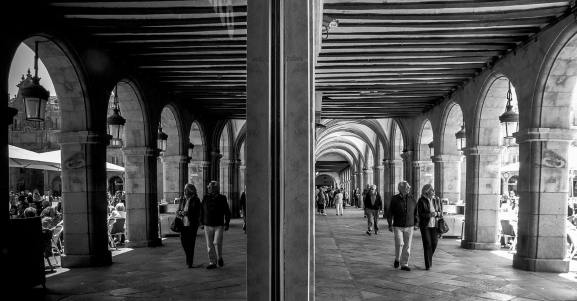 La Mirada de SALAMANCArtv AL DÍA de este jueves se detiene en la Plaza Mayor. Aitor Mata ha detenido el tiempo en este reflejo de los soportales del ágora, donde se ve pasar la vida.