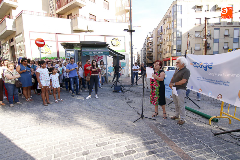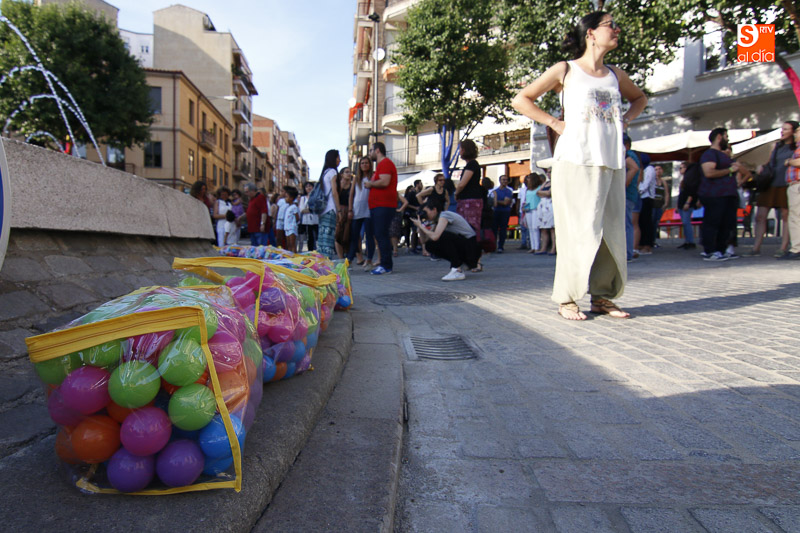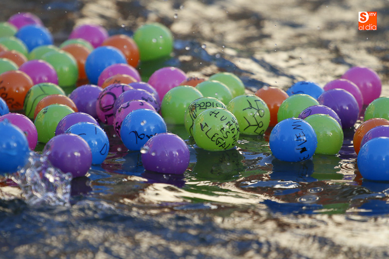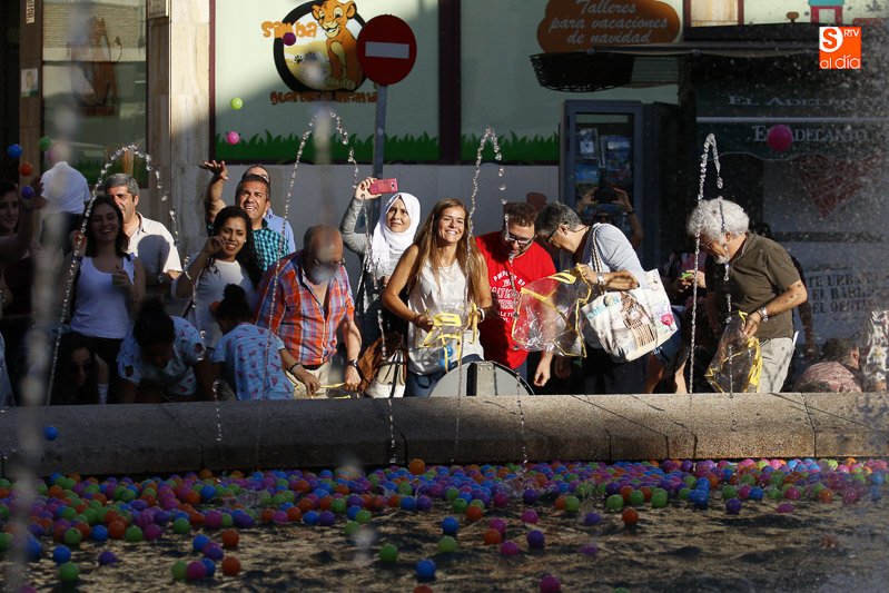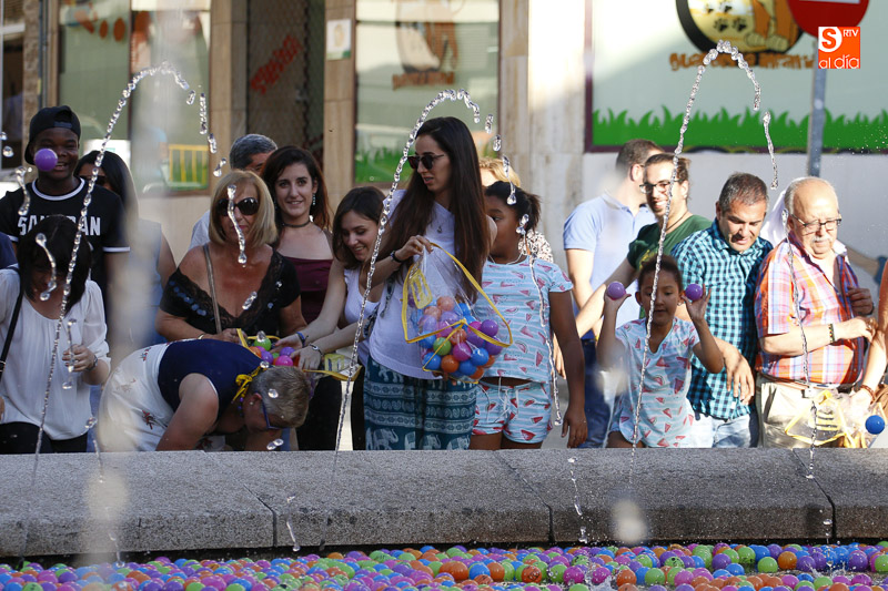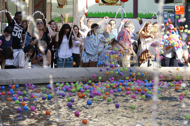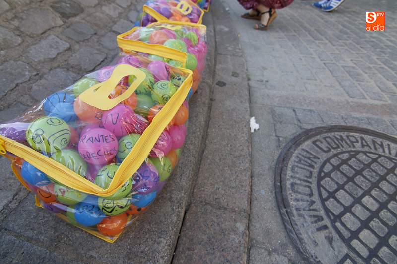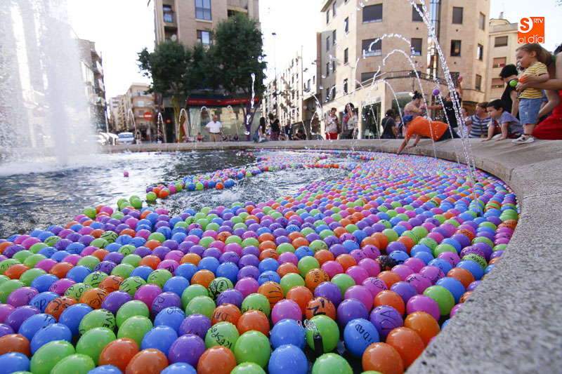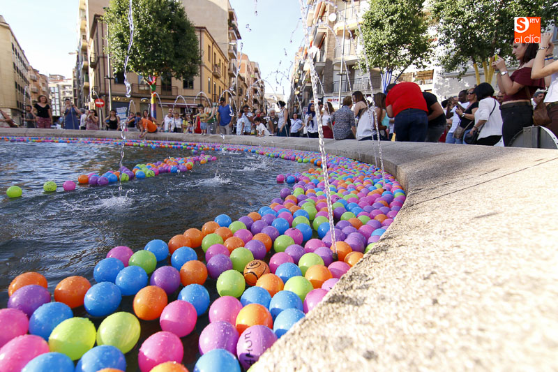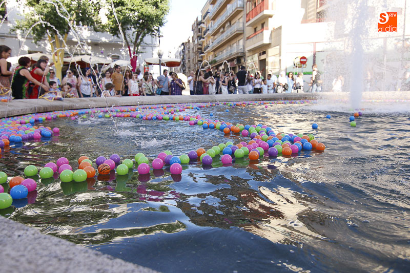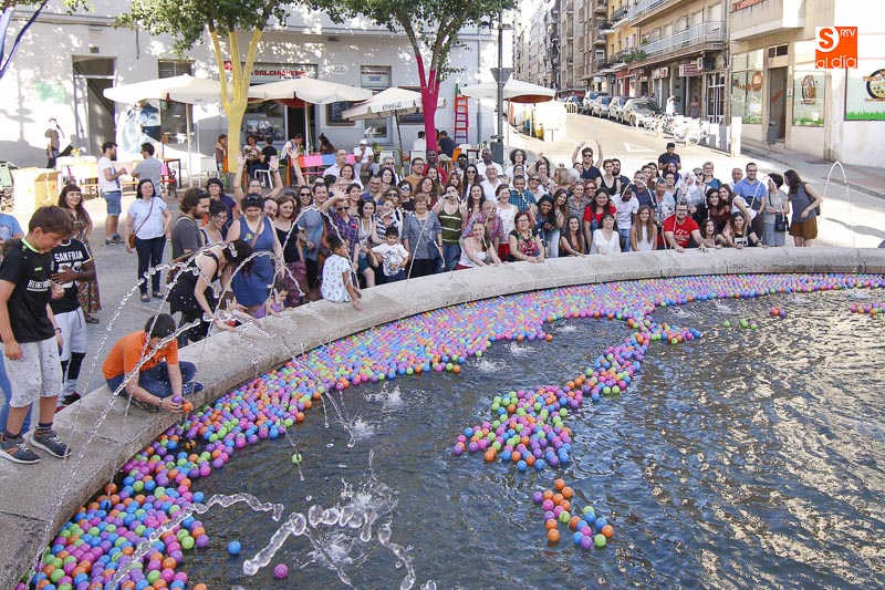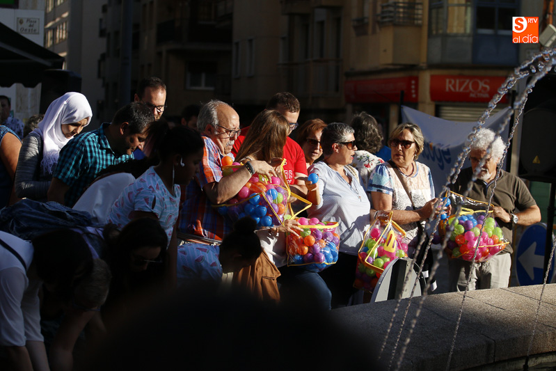 En la fuente de la Plaza del Oeste han lanzado pelotas de colores con frases que reivindican la diversidad como símbolo de la sociedad plural y diversa por la que Red Acoge y Salamanca Acoge apuestan y trabajan.