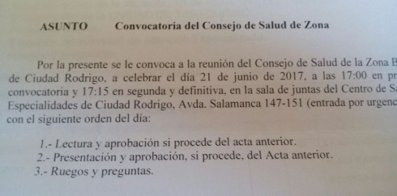 En aquella reunión del miércoles pasado, la gerente del Complejo Asistencial de Salamanca, Cristina Granados, se comprometió formalmente a convocar de nuevo el Consejo de Salud. Cuando no ha pasado ni siquiera una semana de esa reunión, ese Consejo ya ha sido convocado, para el próximo miércoles 21 de junio. Sin embargo, la sorpresa ha llegado al ver el orden del día de la reunión.