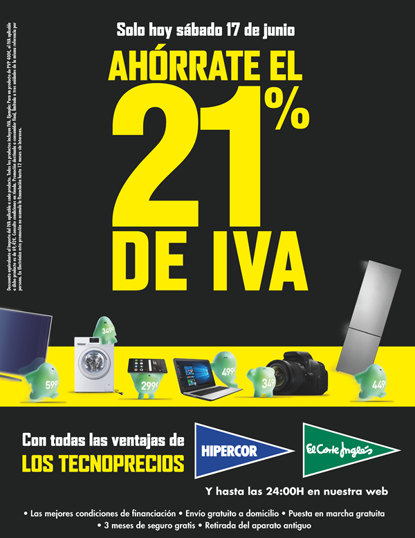 El Corte Inglés lanza una campaña de ahorro en electrónica, electrodomésticos y videojuegos para el sábado 17 de junio con un descuento equivalente al importe del IVA. Los descuentos comenzarán hoy viernes 16 a partir de las 22h en la web: www.elcorteingles.es. En los centros de toda España estarán disponibles desde la apertura hasta el cierre durante todo el sábado 17 de junio y durarán en la web hasta las 24h de ese mismo día.