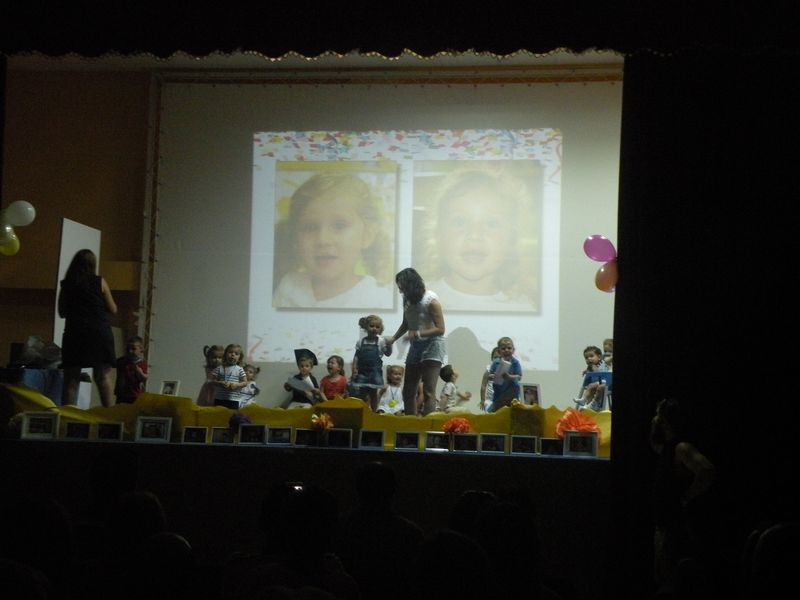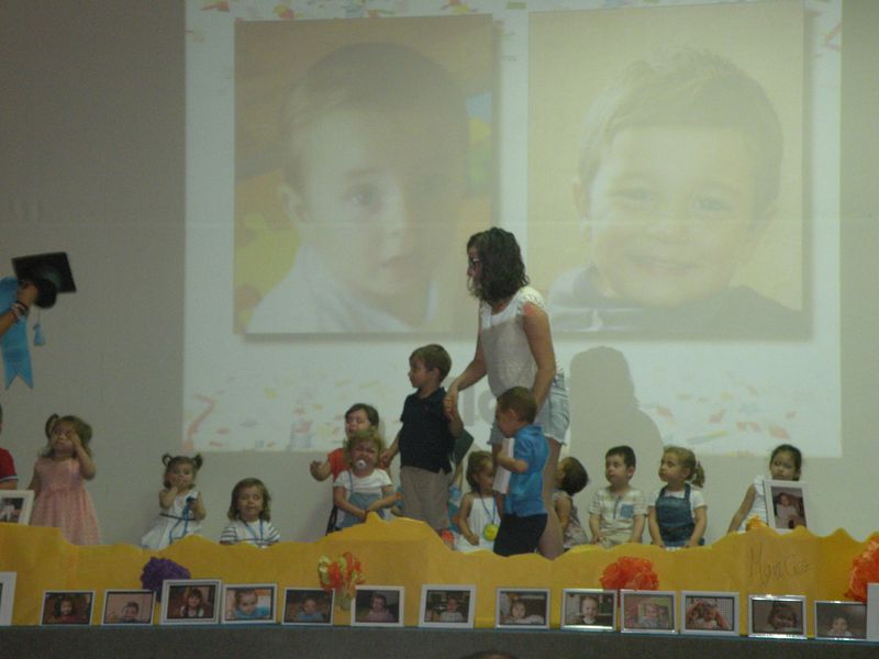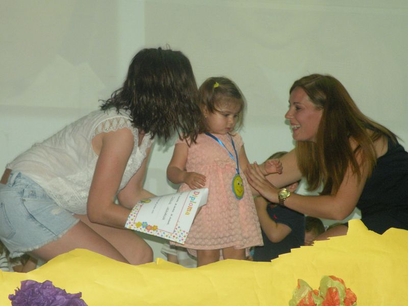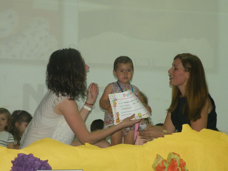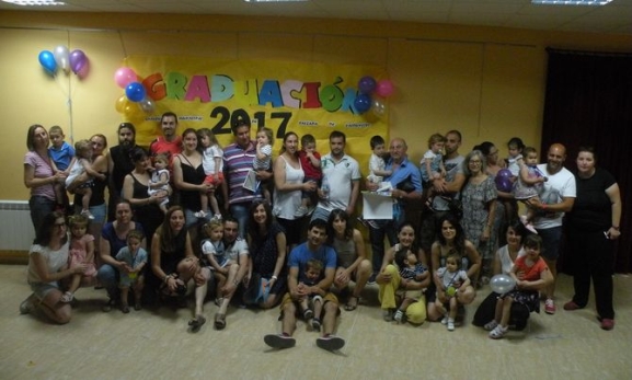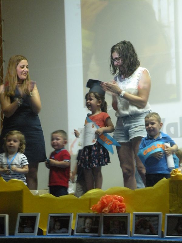 Los dieciocho niños que han asistido con regularidad durante el curso, un poco nerviosos por estar en el escenario y por el tamaño de un edificio que no les es familiar, han recibido un diploma. Además, los pequeños que el próximo curso escolar van a ir al colegio han recibido una banda, un birrete y una orla de graduación.