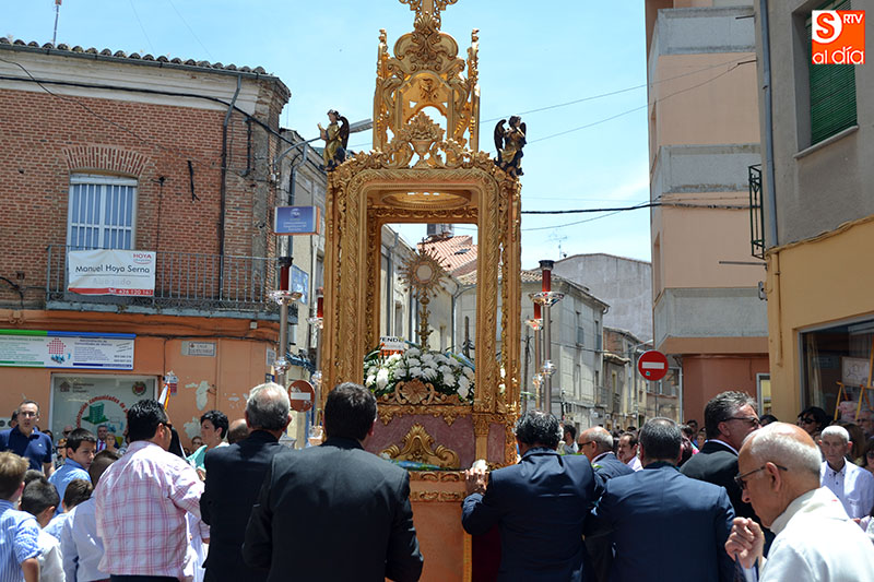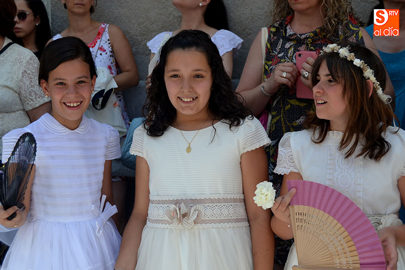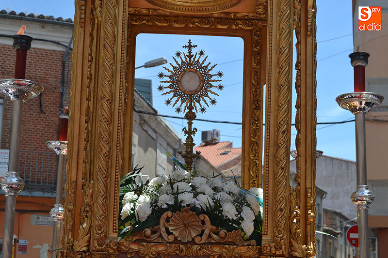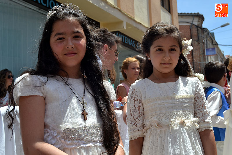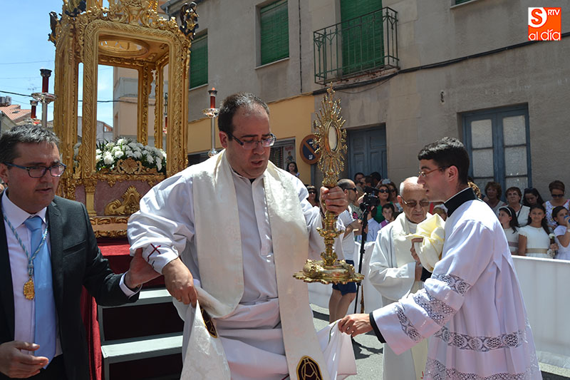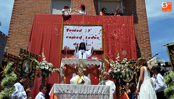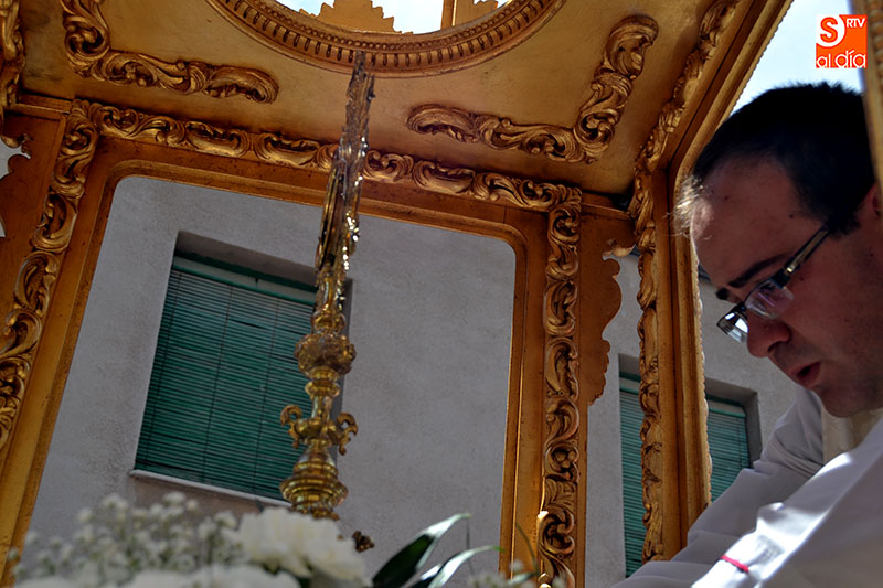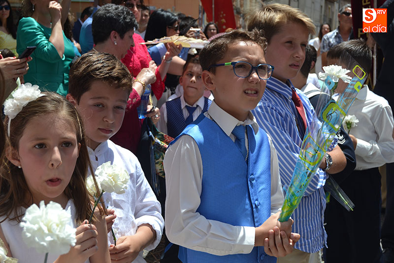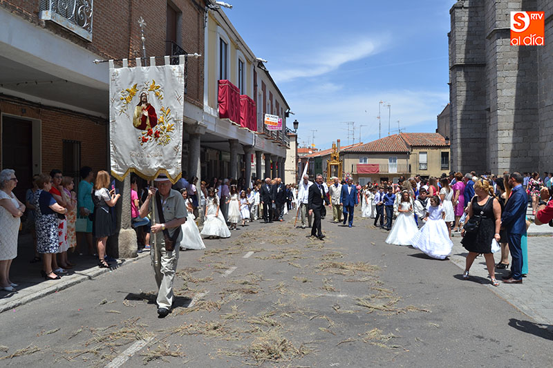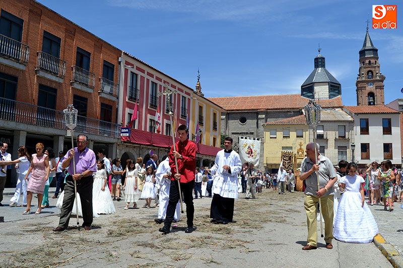 Los actos comenzaban a la una de la tarde en la iglesia parroquial donde el párroco Fernando García oficiaba la solemne eucaristía, tras la que comenzaba la procesión en la que los protagonistas fueron las decenas de niños que han tomado la Primera Comunión quienes fueron los encargados de acompañar a la Custodia en su procesión en el ya tradic