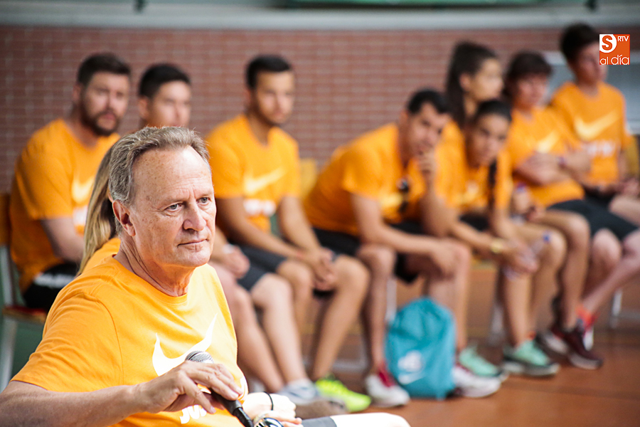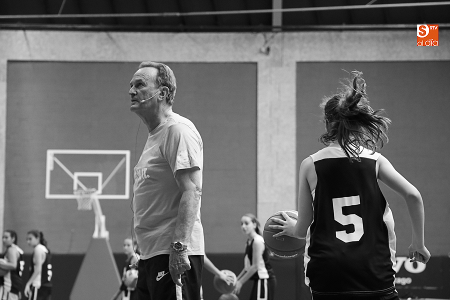 Quedando lejos las nubes y la lluvia del día anterior, Carbajosa se bañaba en sol para recibir a la primera de las visitas de la jornada. Nada más y nada menos que Aito García Reneses, un maestro de los banquillos del baloncesto nacional e historia viva de este deporte. Pequeños, jóvenes y entrenadores resolvieron dudas, compartieron anécdotas y se empaparon de la sabiduría baloncestística del entrenador del Alba Berlín.