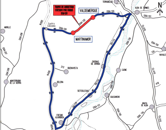 Con motivo de la ejecución de las obras de ensanche y refuerzo de firme de la carretera DSA-120, en el tramo comprendido entre los municipios de Martinamor y Valdemierque, promovidas por la Diputación de Salamanca dentro de los planes de inversión de carreteras, dicho tramo de carretera permanecerá cerrado al tráfico de vehículos del 3 de julio al 16 de octubre.