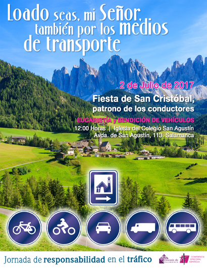 "Loado seas, mi Señor, también por los medios de transporte", es el lema de este año de la Jornada de Responsabilidad en el Tráfico y fiesta de San Cristóbal que la Diócesis celebra este domingo 2 de julio. Como cada año el Secretariado diocesano de Apostolado en Carretera invita a sumarse a la celebración de la misa, en la fiesta del patrono de los conductores San Cristóbal, a las 12.00 horas, en la capilla del Colegio San Agustín de Salamanca, y a la posterior bendición de vehículos, en la avenida de San Agustín. La celebración será presidida por el director de dicho secretariado, Gabino Martín Vicente.