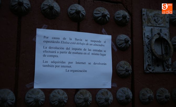 La lluvia ha obligado a suspender la obra de teatro 'Eloísa está debajo de un almendro', programada para las 22.30 horas en Las Noches del Fonseca. La devolución del importe de las entradas se efectuará a partir de mañana en el mismo lugar de compra.
