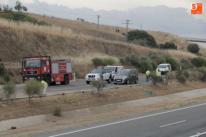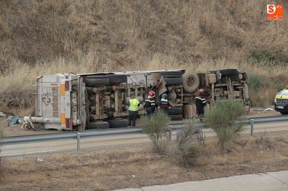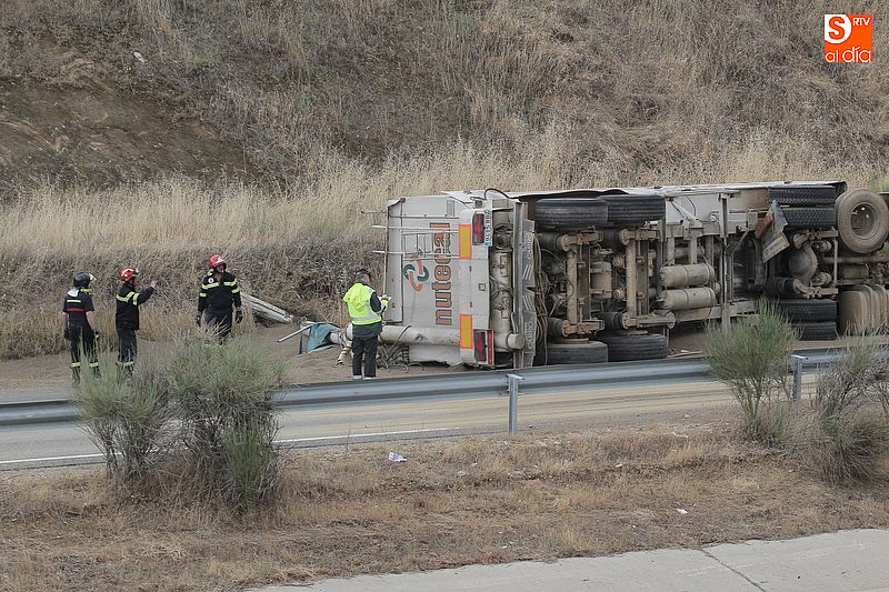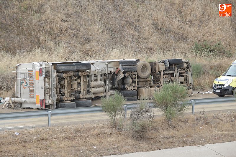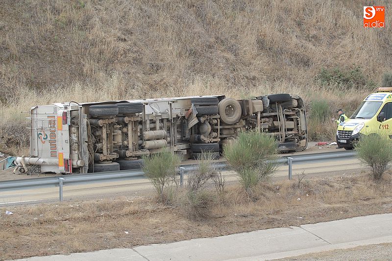 M. P. E., de 54 años, conductor un camión de gran tonelaje ha resultado herido grave en la A-66, término de Gujijuelo, sentido Béjar, tras volcar el vehículo en el que viajaba solo, en el kilómetro 390. El vehículo - tractocamion marca Scania, y semirremolque marca Lastanosa- se salió de la vía por el margen izquierdo, chocando contra la bionda para volcar después.