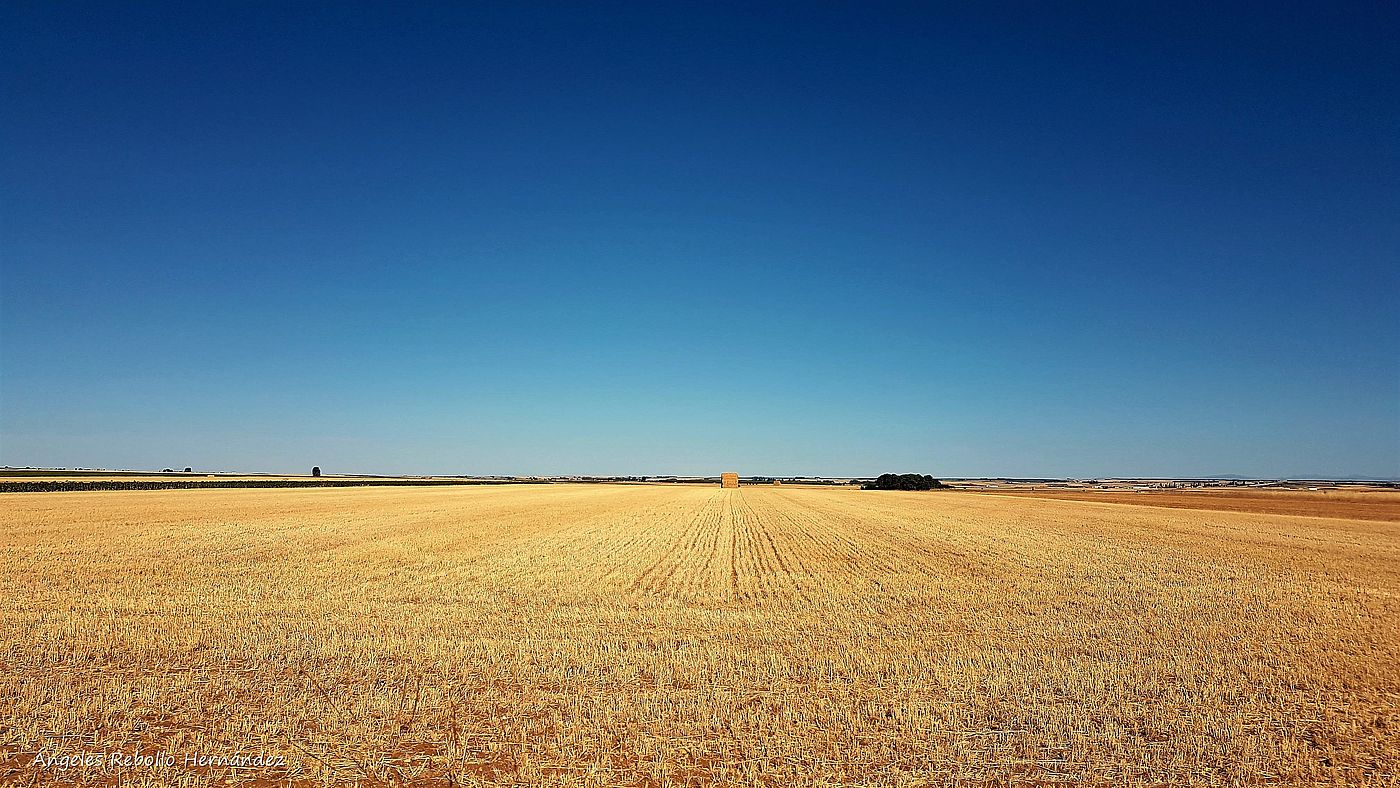 Tierra y cielo. Oro y azul. Mieses segadas y aire. Entre estos dualismos existimos, está nuestro latir. Vida de lo esencial. Porque es en ese vértigo, tan hermoso y absoluto, en el que transcurre nuestra vida. Y nada más es necesario. Porque es aquí, en esta belleza, tan luminosa y despojada, donde transcurrimos, donde nacemos, trabajamos, anhelamos, amamos y dejamos testigos de lo que fue nuestro paso por esta maravilla. Y es ahí, en la línea del horizonte, tan delgada y sutil, donde están esos pueblos en que moramos y en los que arde nuestro fuego, mientras estamos vivos.