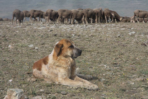 Vigilancia callada del mastín. También las criaturas persiguen siempre un orden. Las ovejas, recién esquiladas, viven gregariamente y buscan en las aguas y en la tierra un sustento de vida. Protección sosegada del mastín. Porque hay que proteger lo logr