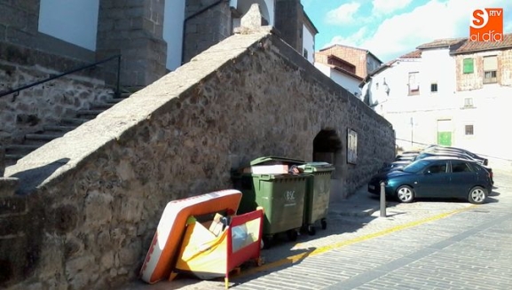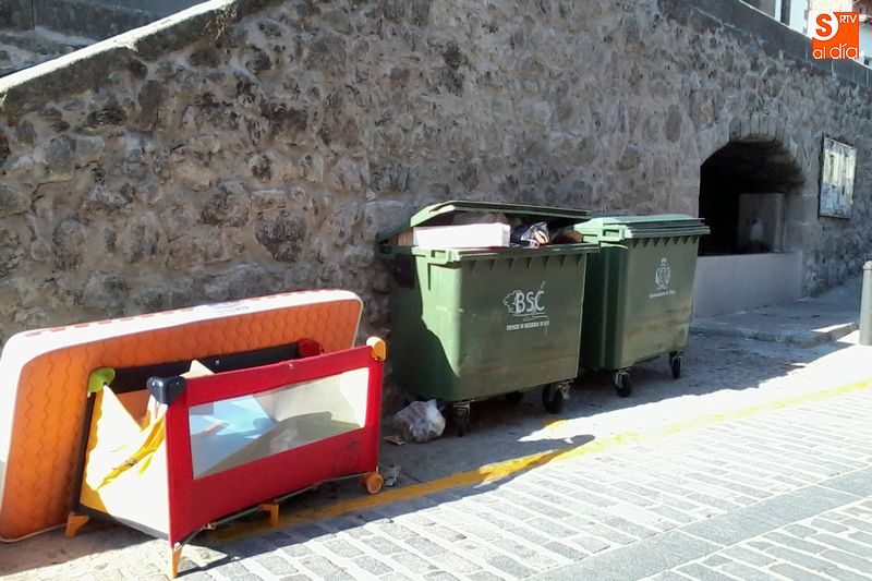 Desde el pasado viernes un colchón y una cuna plegable están junto a los contenedores de la puerta de la iglesia de Santa María, porque alguien ha decidido sacar estos enseres para que se luzcan durante todo el fin de semana y sean contemplados por quienes vienen a visitar la ciudad.