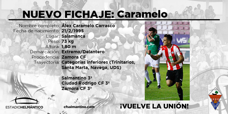 El CF Salmantino ha presentado este lunes a su penúltima incorporación, el extremo charro Álex Caramelo, que regresa al club tras consolidarse en la Tercera División en el Ciudad Rodrigo y en el Zamora CF las dos últimas temporadas. El jugador, que ocupará ficha sub-23, reconocía en su presentación oficial en el Helmántico, que "para mí supone la vuelta a casa y espero devolver la oportunidad que me dieron en mi anterior etapa, además de dar un paso deportivamente".