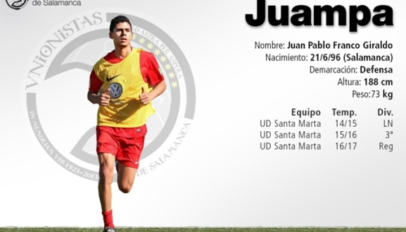 Unionistas de Salamanca CF ha llegado a un acuerdo con la Unión Deportiva Santa Marta y con el futbolista salmantino Juan Pablo Franco Giraldo 'Juampa', que jugará en calidad de cedido en el club charro hasta junio de 2018.