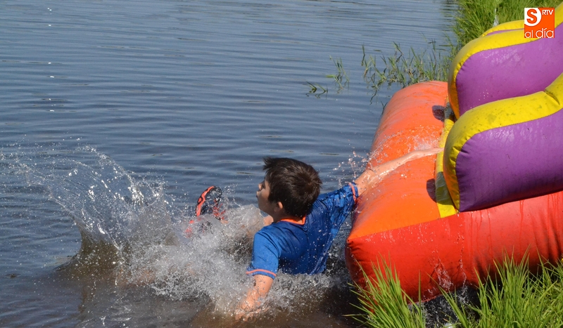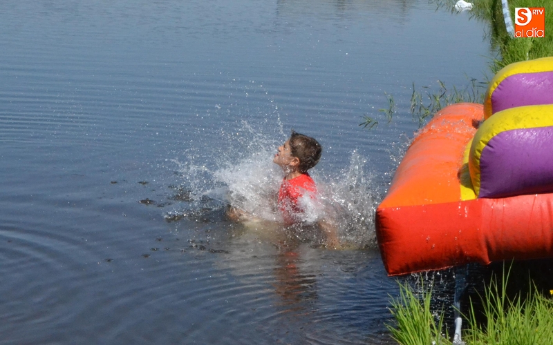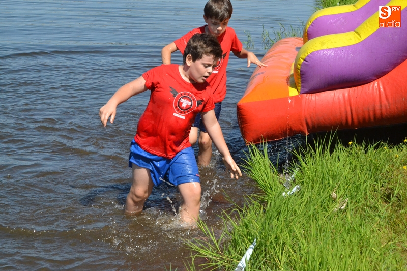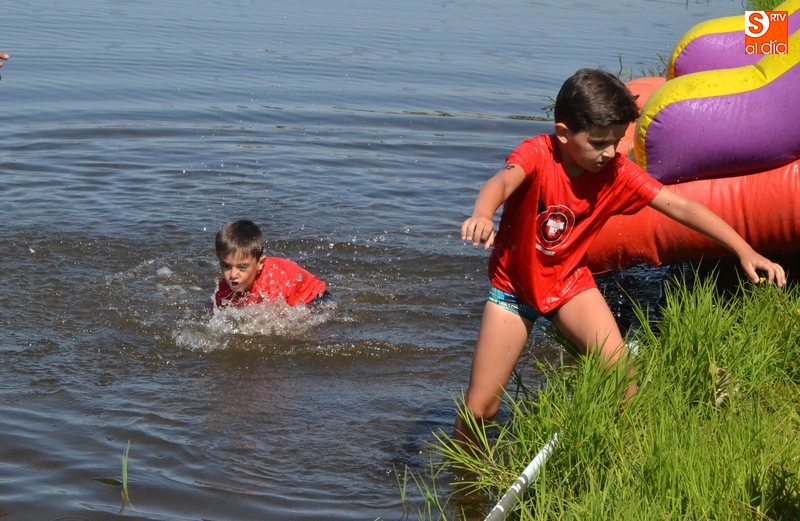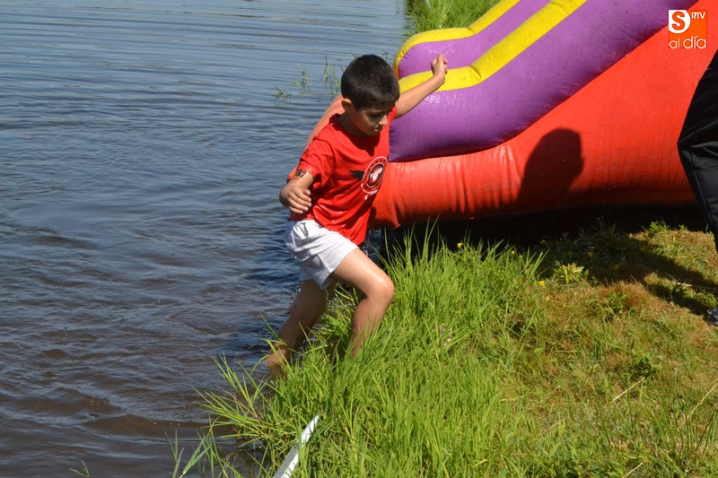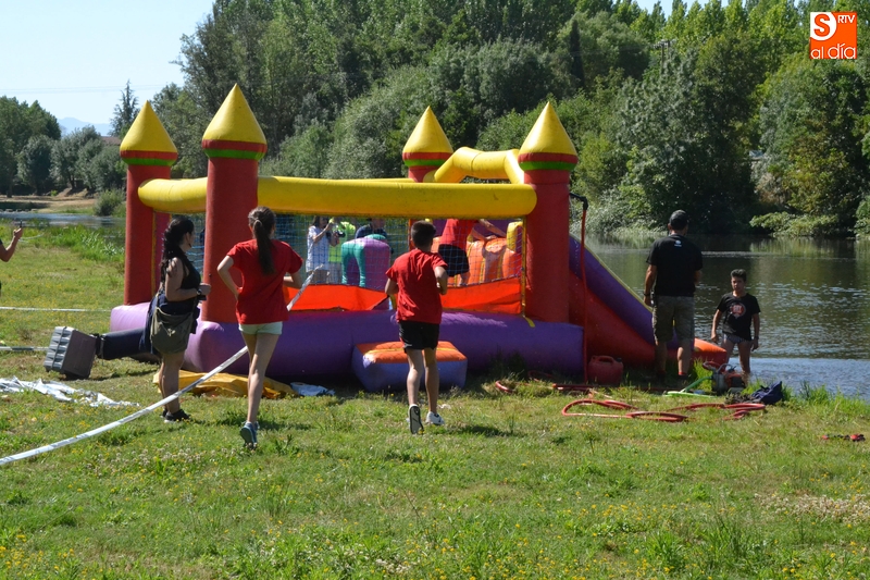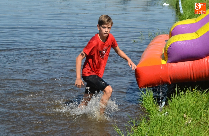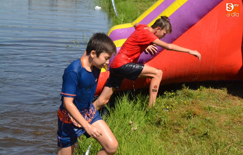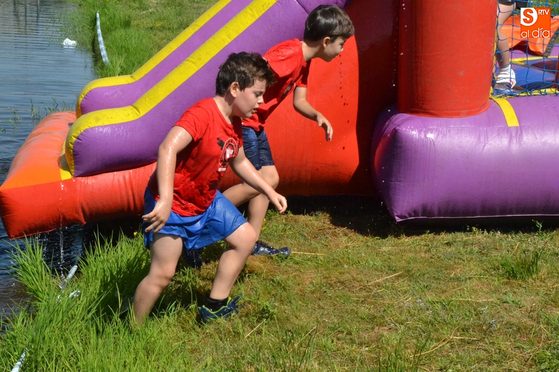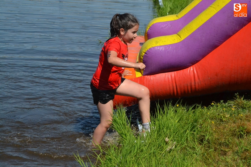 En este sentido, hubo varios obstáculos distribuidos por la orilla del río, incluido un castillo hinchable, al que había entrar por una puerta y salir por un pequeño tobogán que finalizaba en el propio río. Este obstáculo incluía una cortina de agua para ayudar a deslizar a los chavales por el tobogán.