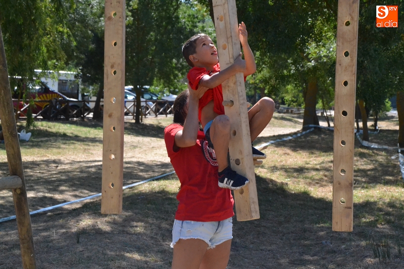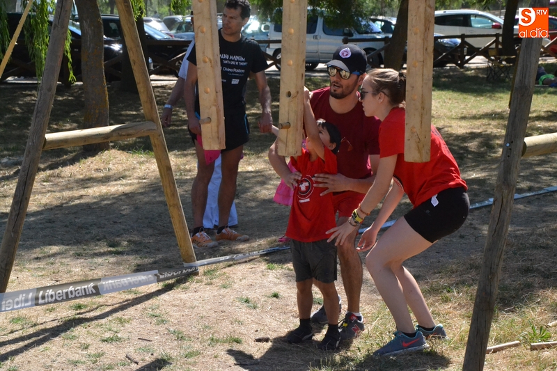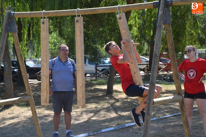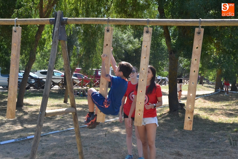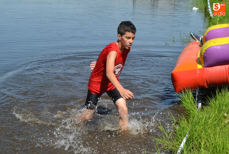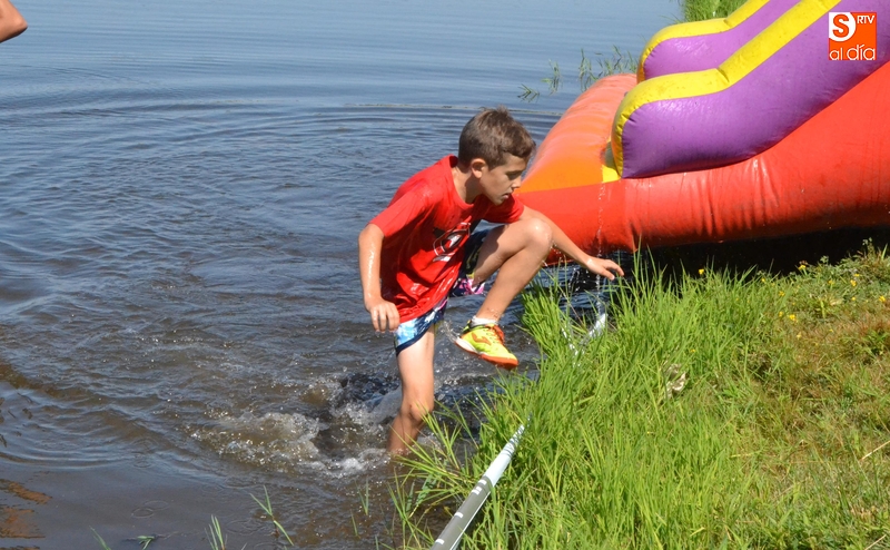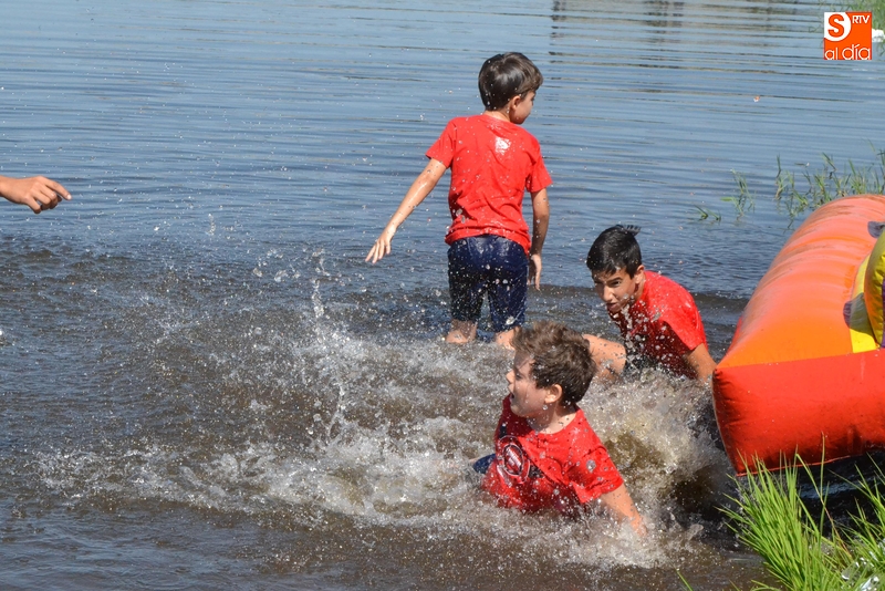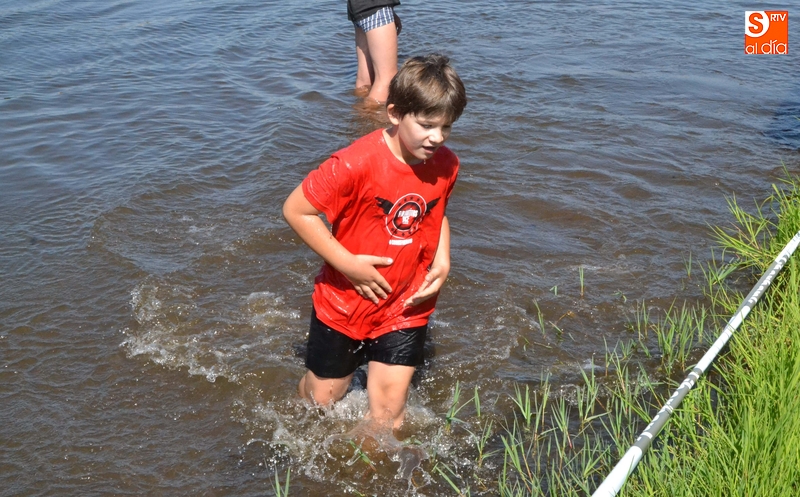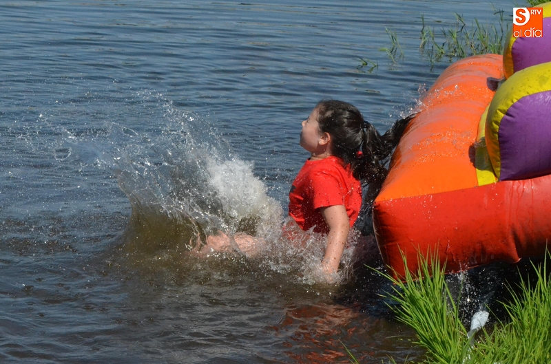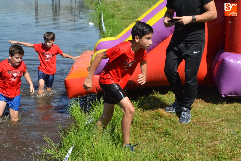 En este sentido, hubo varios obstáculos distribuidos por la orilla del río, incluido un castillo hinchable, al que había entrar por una puerta y salir por un pequeño tobogán que finalizaba en el propio río. Este obstáculo incluía una cortina de agua para ayudar a deslizar a los chavales por el tobogán.
