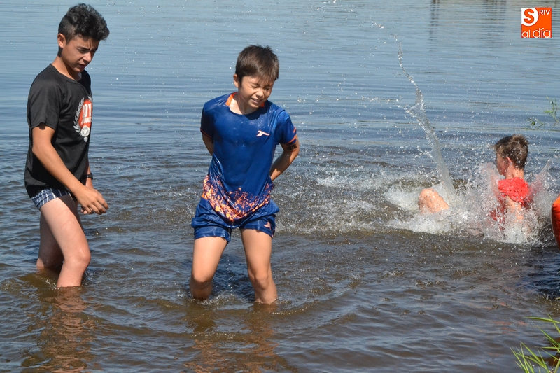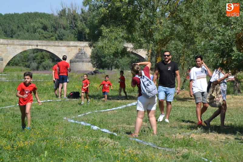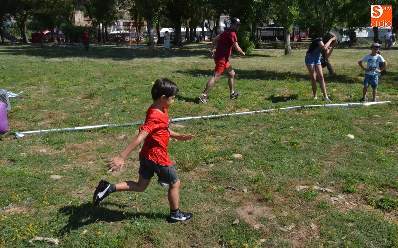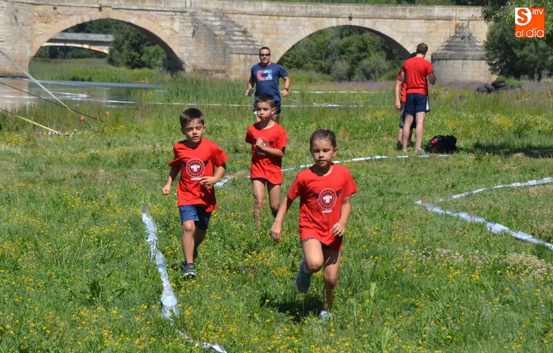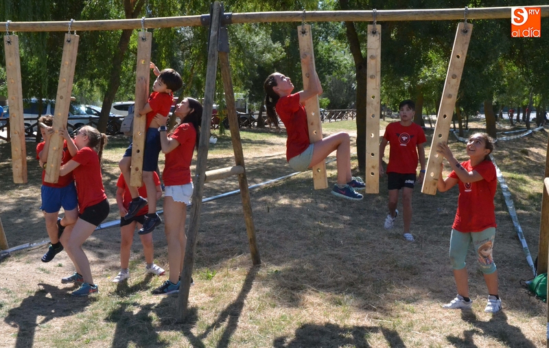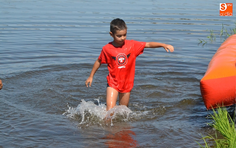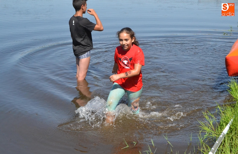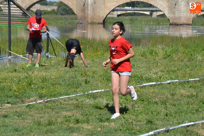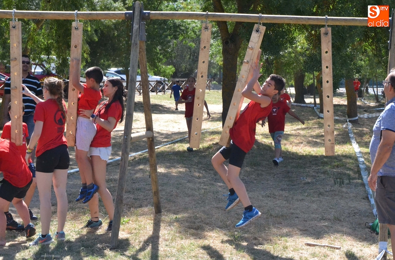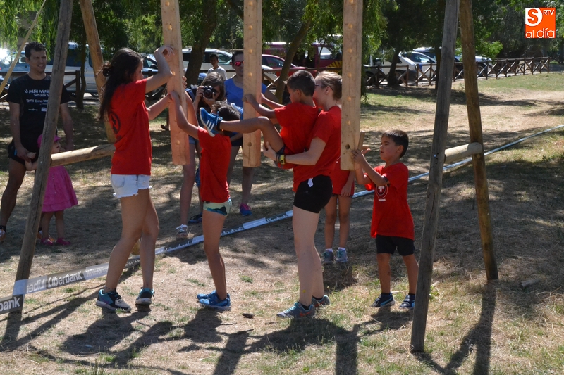 En este sentido, hubo varios obstáculos distribuidos por la orilla del río, incluido un castillo hinchable, al que había entrar por una puerta y salir por un pequeño tobogán que finalizaba en el propio río. Este obstáculo incluía una cortina de agua para ayudar a deslizar a los chavales por el tobogán.