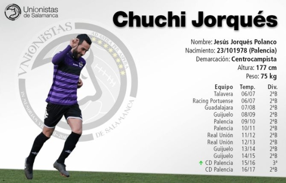 Chuchi Jorqués llega a Unionistas procedente del CD Palencia con una larga trayectoria en la categoría de bronce del fútbol español a sus espaldas. Se trata de un centrocampista zurdo muy técnico, con un gran último pase y un excelente disparo desde fuera del área. El palentino, que llegó a jugar en las categorías inferiores de la Unión Deportiva Salamanca, ha sido pieza clave en todos los equipos en los que ha militado en su amplia trayectoria en Segunda B, llegando a disputar tres fases de ascenso a segunda división.