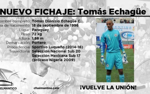 El guardameta paraguayo Tomás Echagüe es desde hoy futbolista del CF Salmantino UDS para la temporada 2017-18, en la que el club charro se ha marcado el ambicioso objetivo de clasificarse para el play-off para poder optar al ascenso a Segunda División B.