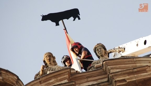 Los bomberos colocarán a las 21.00 horas la bandera española y la silueta negra de un toro en la espadaña del Ayuntamiento