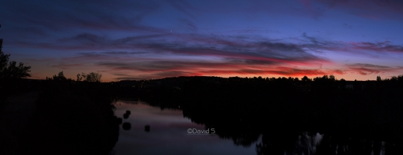 Atardecer desde el Puente de la Universidad, con el río Tormes en primer plano y la luna en el cielo