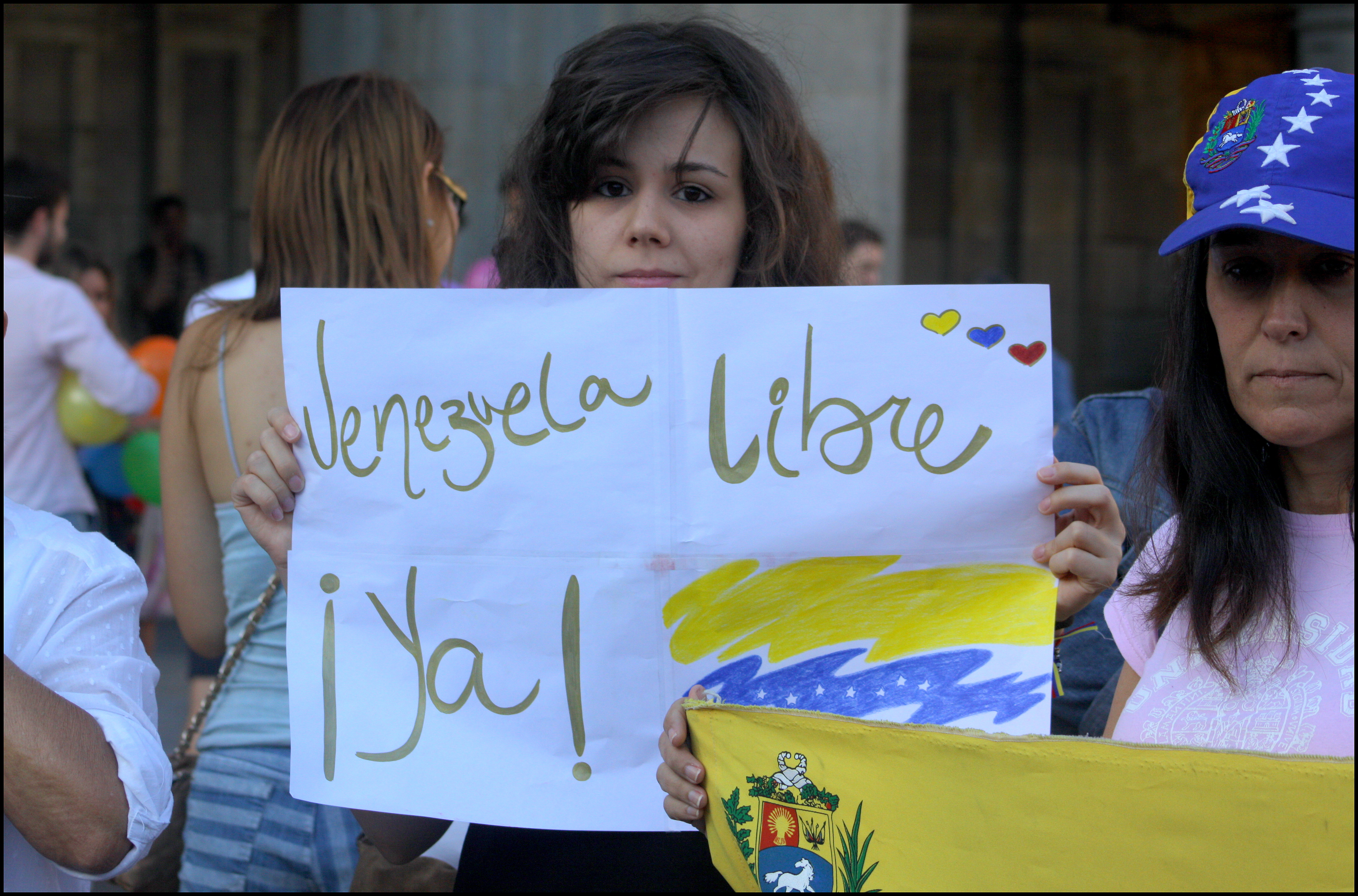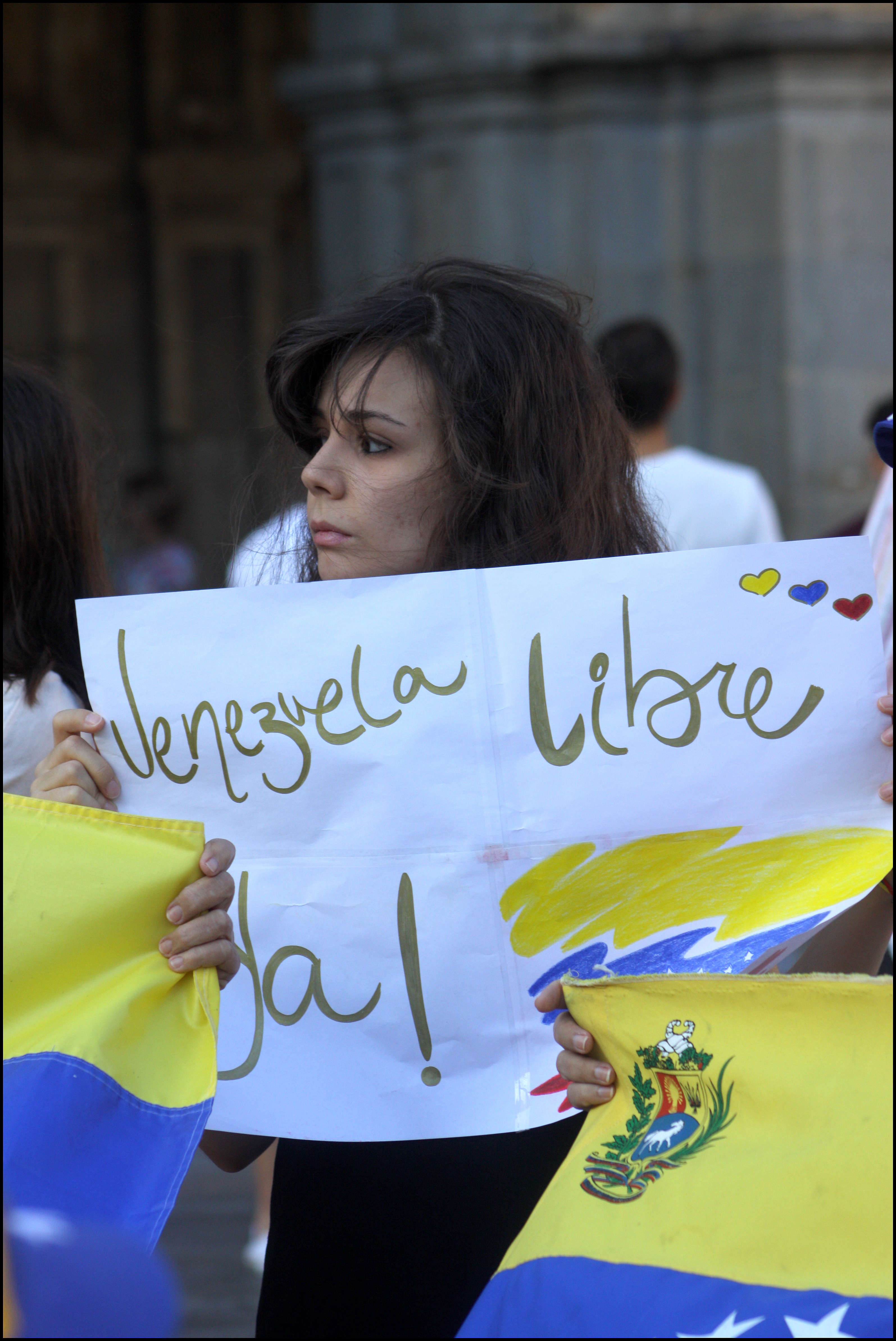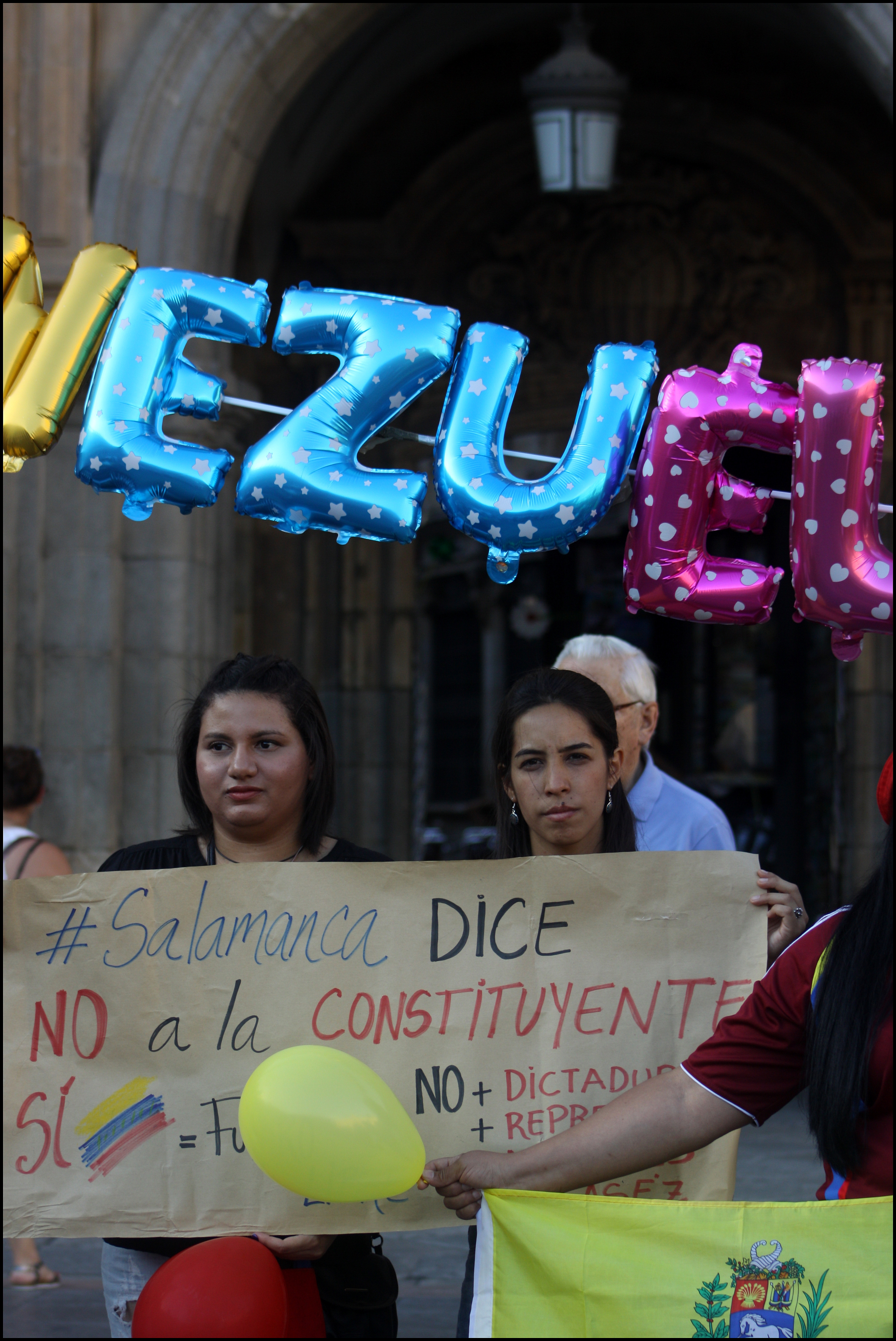 'Salamanca dice no a la Constituyente' o 'Venezuela libre ¡ya!' han sido algunos de los lemas de las las pancartas con las que venezolanos residentes en Salamanca han salido a la calle para pedir el final de la dictadura, la represión y la muerte, el mismo día en que se celebraban las votaciones de la Constituyente impulsada por Nicolás Maduro. La convocatoria, en la Plaza Mayor, ha mostrado su rechazo a la Asamblea Nacional Constituyente.