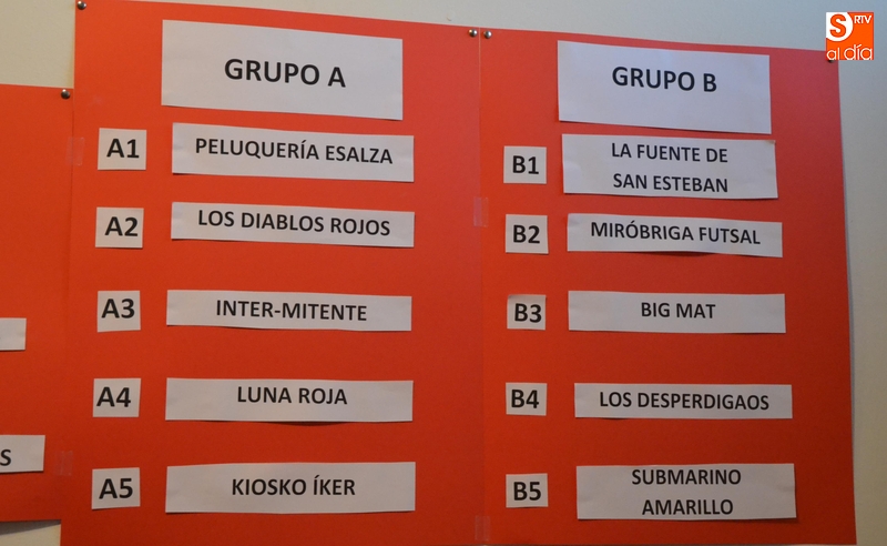 En el Grupo A, están Peluquería Esalza, Los Diablos Rojos, Inter-mitente, Luna Roja y Kiosko Iker/Pub Excalibur; y en el Grupo B, La Fuente de San Esteban, Miróbriga Futsal, Big Mat, Desperdigaos y Submarino Amarillo.