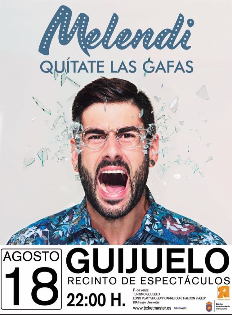 El conocido artista Melendi vuelve a Guijuelo por tercera vez. Tras el éxito de su visita en 2014, la villa recibirá de nuevo al cantante asturiano el próximo 18 de agosto, a las 22.00 horas, en su gira 'Quítate las gafas'.