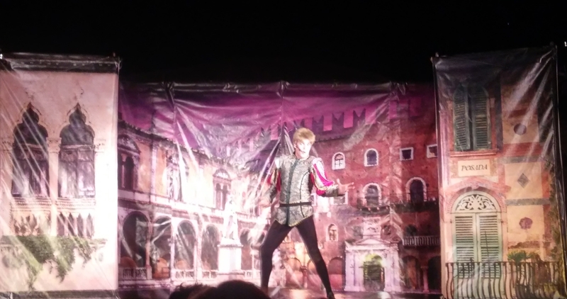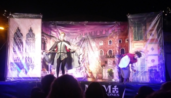 La primera de ellas -que tuvo lugar en la noche del martes- fue una obra de teatro, titulada Los dos gemelos venecianos, de MDM Producciones. En esta obra se narra la historia de Tonino y Patricio, dos gemelos que fueron separados desde niños y que no se han visto nunca, aunque saben cada uno de la existencia del otro. La obra fue presenciada por unos cuantos vecinos en la Plaza Mayor en una noche bastante fresca.