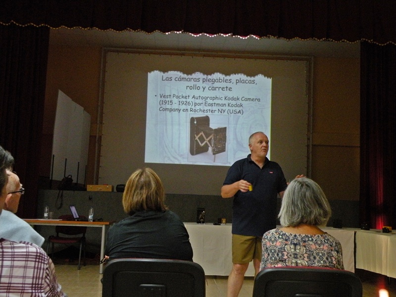 A lo largo de poco más de una hora, hizo a los asistentes un interesante recorrido de su historia desde la cámara oscura a las máquinas reflex, pasando por los daguerrotipos, las cámaras de fuelle, de cajón, compactas,... hablando tanto del diseño de su maquinaria como los diferentes modos utilizados para su fijación en papel y positivado (nitrato de plata, placa, rollo, carrete...). Todas sus explicaciones estuvieron ilustradas con algunas de las máquinas de su colección, por lo que resultó entretenido y educativo.