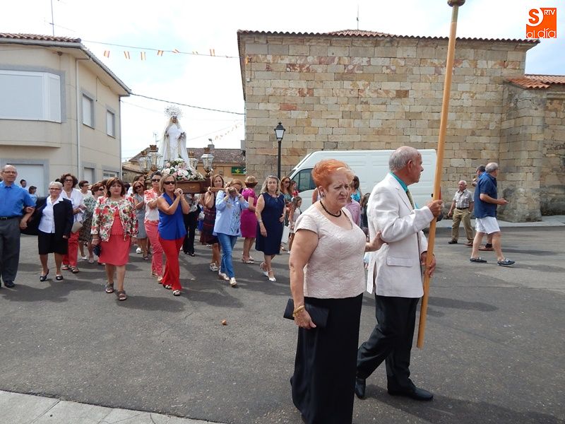 Ambiente festivo en Valdelosa en una de las jornadas centrales de las fiestas patronales y que, siguiendo la tradición, ha arrancado con la misa y procesión en honor a Nuestra Señora de la Asunción. Misa cantada por el grupo Salamenco y que ha precedido a la salida de la imagen de la Virgen, portada por las mujeres de Valdelosa y escoltada por la devoción de numerosos vecinos y fieles.