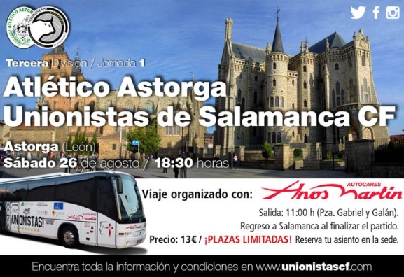 La afición de Unionistas de Salamanca CF podrá desplazarse de forma cómoda y barata hasta Astorga (León) para ver en directo el primer partido de liga. El encuentro se celebrará el próximo sábado 26 de agosto, a las 18.30 horas, en La Eragudina. Las plazas son limitadas y por estricto orden de reserva.