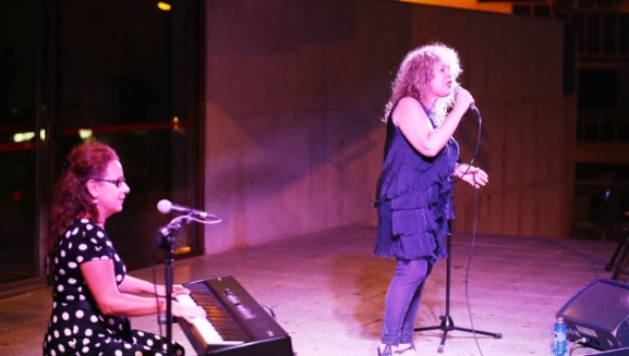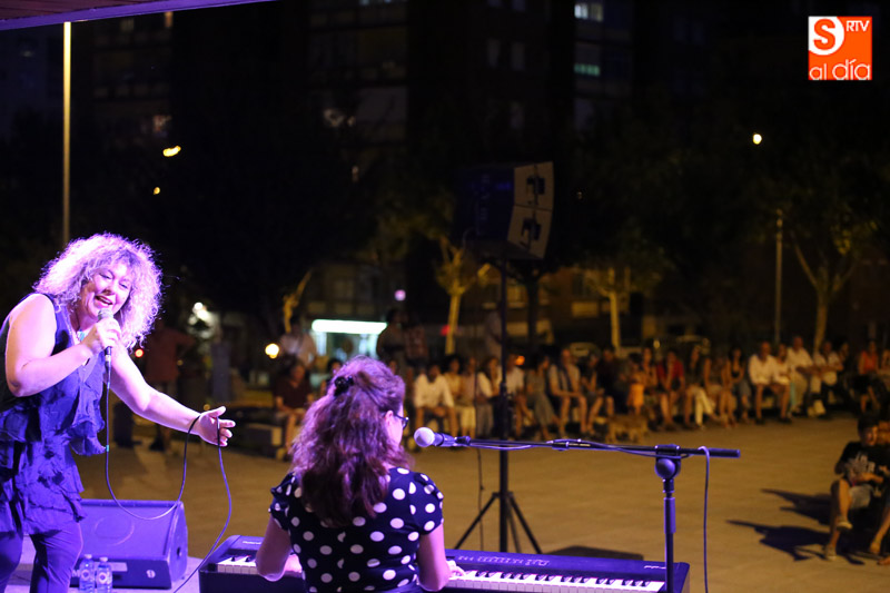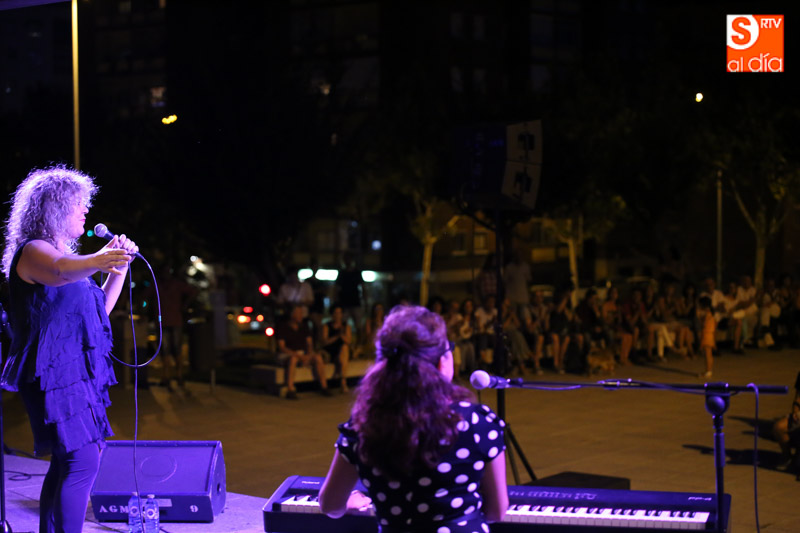 Los aledaños de la biblioteca municipal Gonzalo Torrente Ballester acogieron este jueves una nueva edición del programa 'Verano se escribe con Blues'. En esta ocasión el protagonismo correspondió al dúo Big Mama Montse & Sister Marion, que con su concierto cautivó al público asistente, envolviendo el ambiente con su mágico blues.