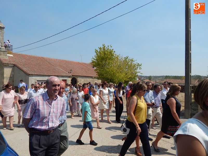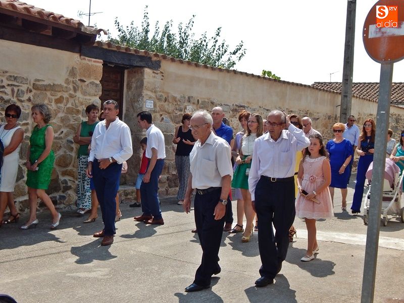 La iglesia de Golpejas se ha llenado en el día de San Bartolomé, cuyas puertas se han abierto al son de las campanas para la salida de la imagen del patrón, escoltada por el grupo de jóvenes mayordomos y convecinos, y al son de los bailes charros en su honor a lo largo del recorrido.