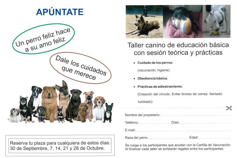 Los talleres, que son gratuitos, serán impartido por educadores caninos de la Asociación Nacional de Adiestradores Caninos Profesionales, y las sesiones, de 11 a 13 horas, se llevarán a cabo en cinco jornadas en el parque frente del Polideportivo Municipal, durante las mañanas de los sábados 30 de septiembre, y 7, 14, 21 y 28 de octubre.