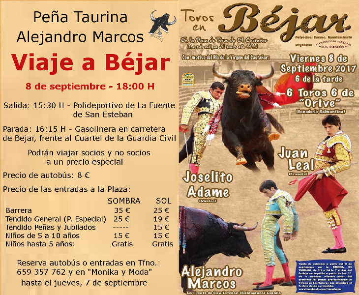 La Asociación Peña Taurina Alejandro Marcos está preparando un viaje a Béjar para el viernes 8 de septiembre, con el fin de asistir a la corrida en la que el diestro salmantino compartirá cartel con Joselito Adame y Juan Leal, con astados de la ganadería "Toros de Orive" y que dará comienzo a las 18:00 horas.