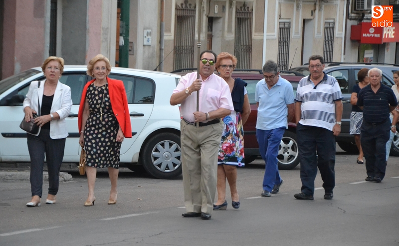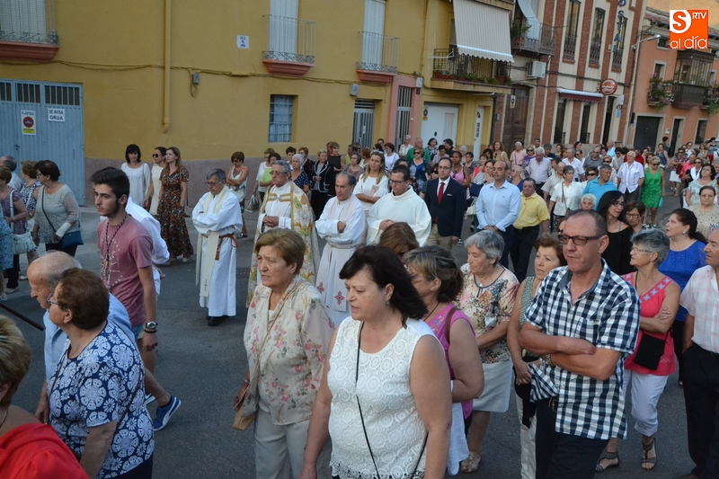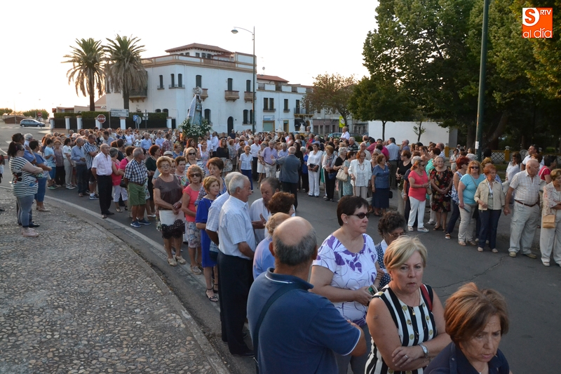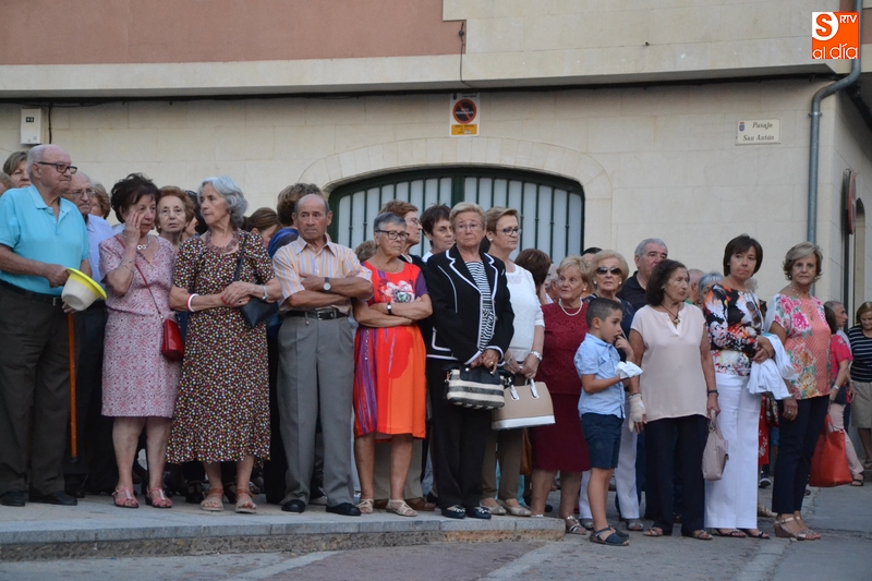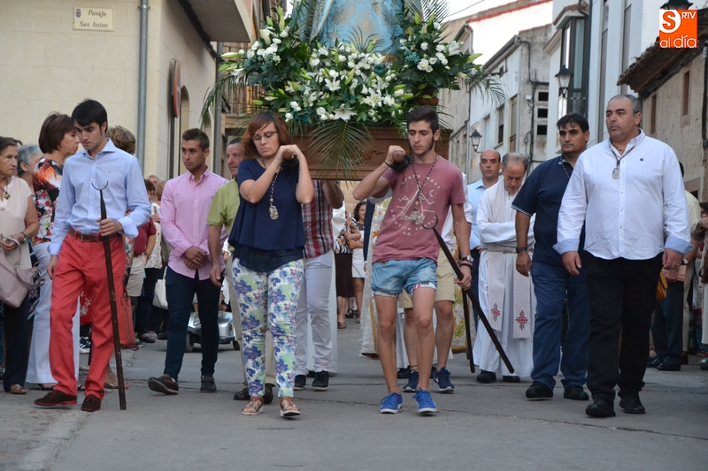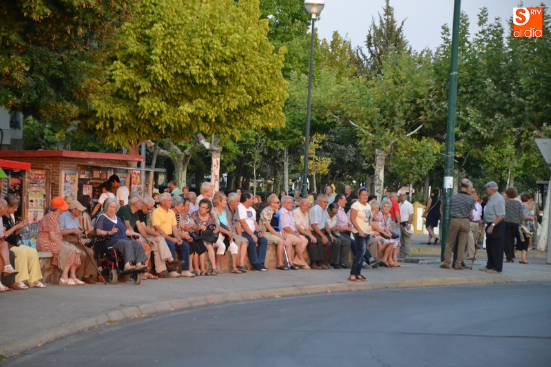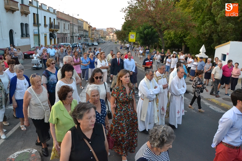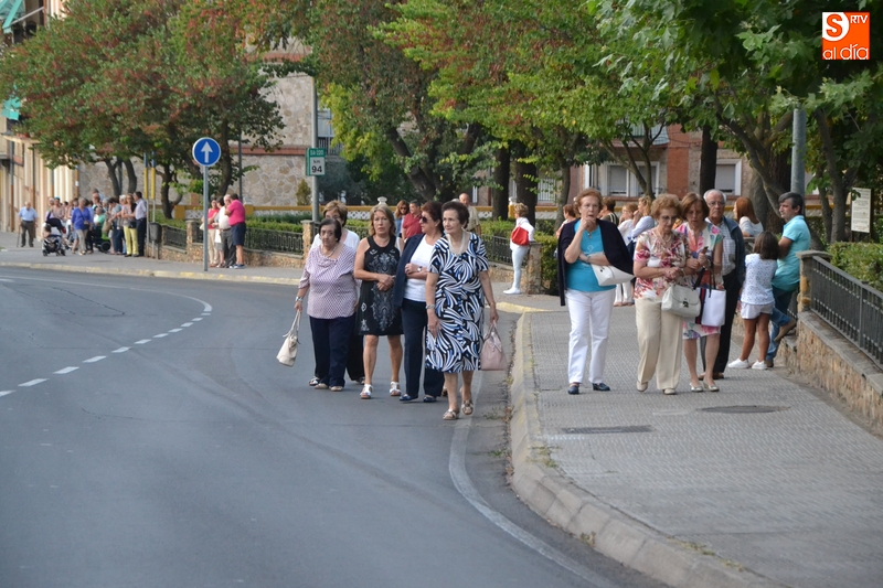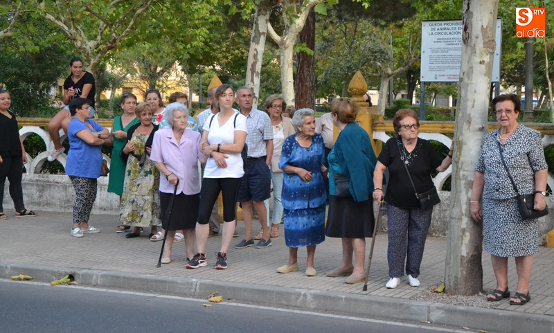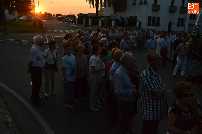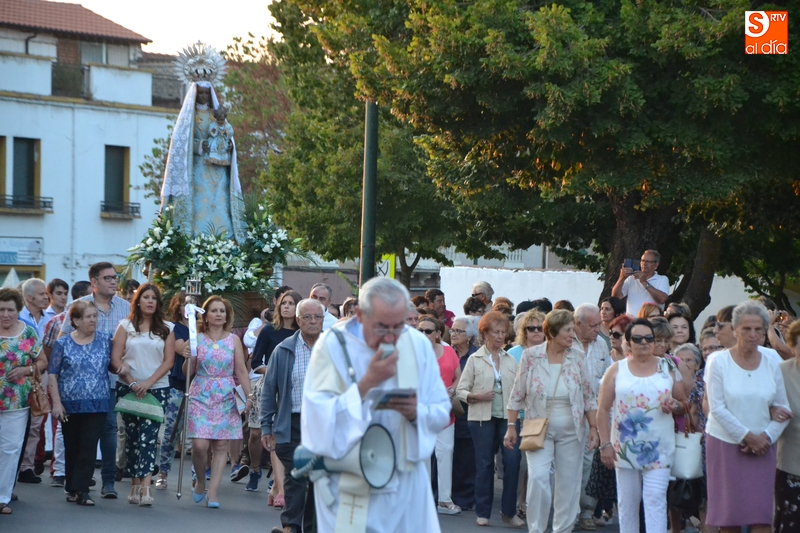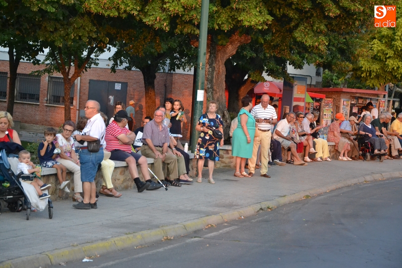 Aunque tuvieron algunos problemas de estabilidad al inicio de la procesión, fueron avanzando con la Virgen desde las puertas de la Iglesia por las calles San Antón y Canal hasta llegar a la Avenida de España, donde se vivió una situación bastante rocambolesca. Resulta que justo al ir a comenzar la procesión, uno de los agentes de la Policía Local se dirigió al párroco, Celso Martín Santos, para decirle que la procesión a su paso por la Avenida de España debía ocupar un único carril, en este caso el derecho en sentido ascendente.