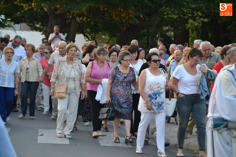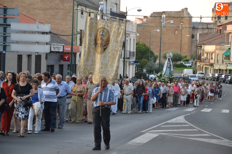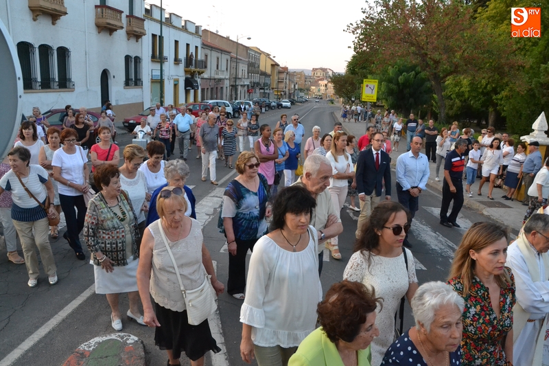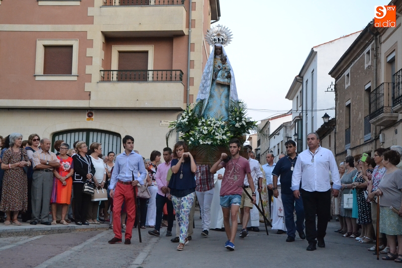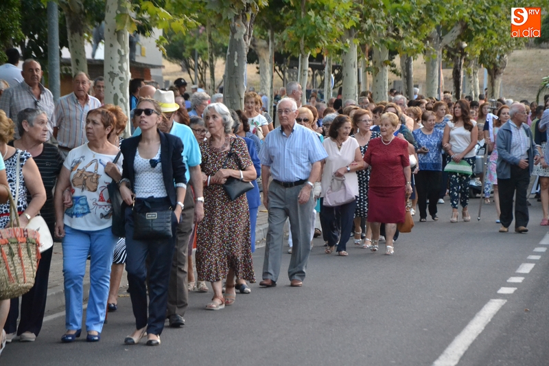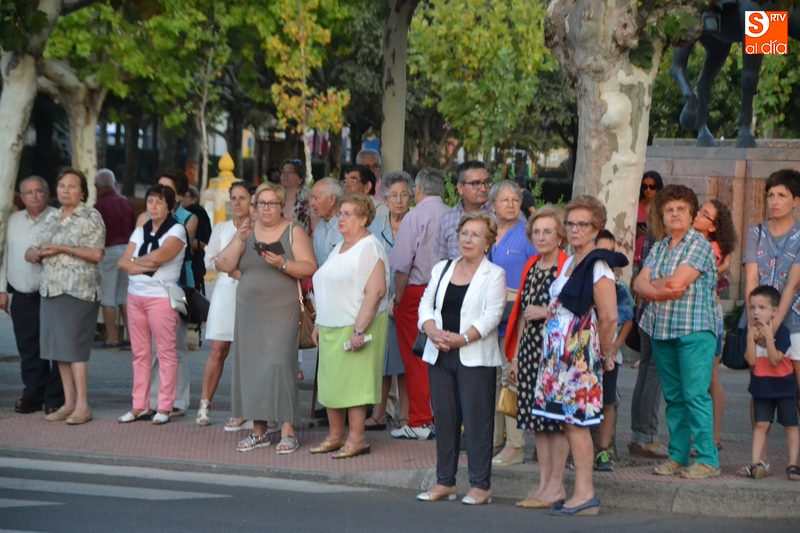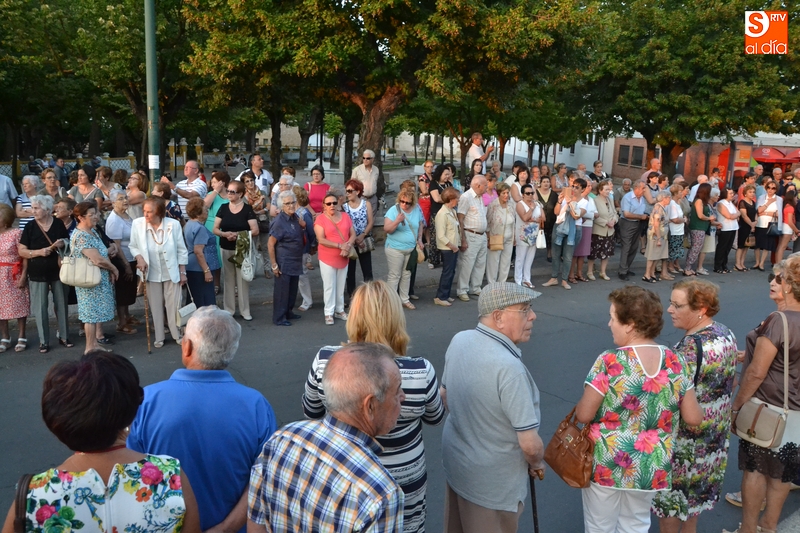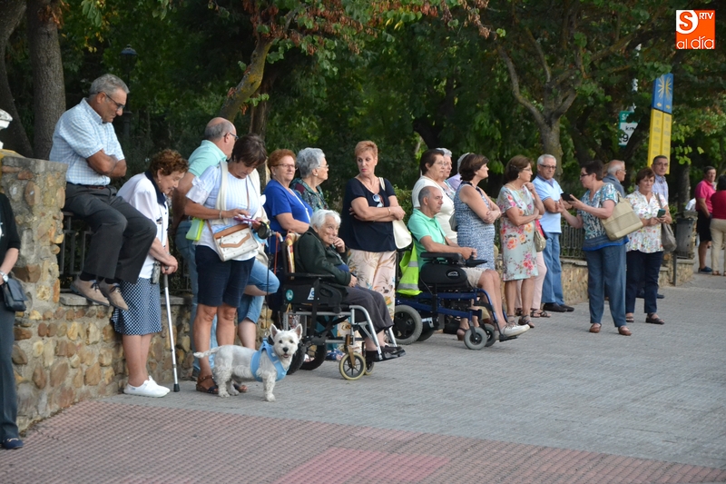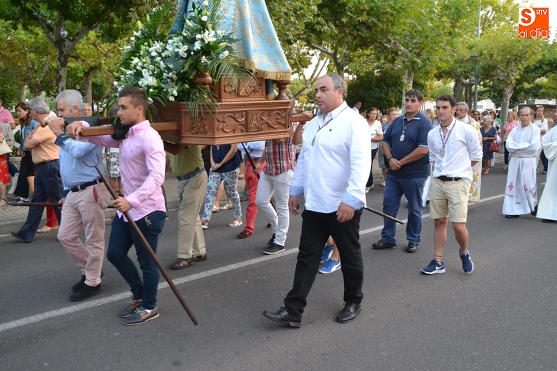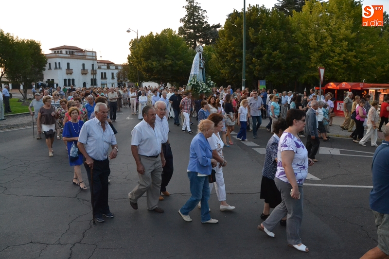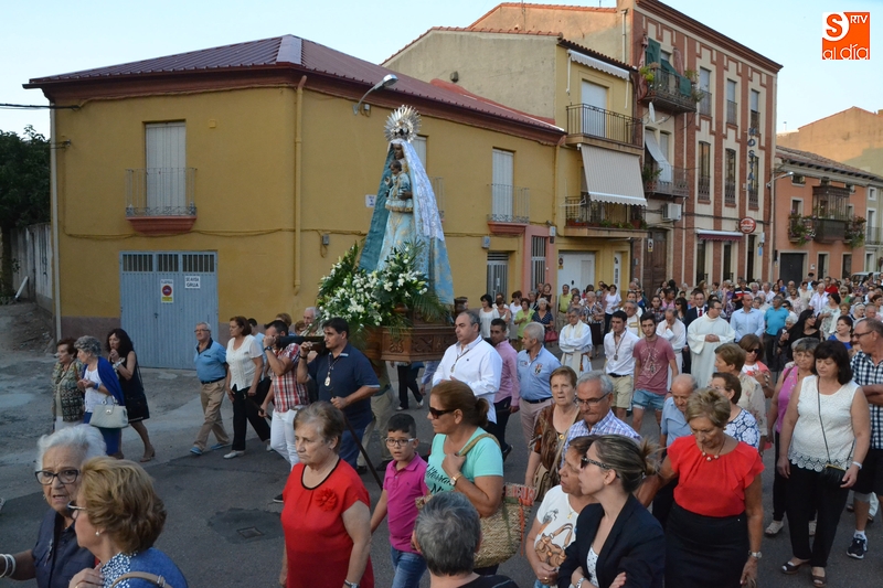 Aunque tuvieron algunos problemas de estabilidad al inicio de la procesión, fueron avanzando con la Virgen desde las puertas de la Iglesia por las calles San Antón y Canal hasta llegar a la Avenida de España, donde se vivió una situación bastante rocambolesca. Resulta que justo al ir a comenzar la procesión, uno de los agentes de la Policía Local se dirigió al párroco, Celso Martín Santos, para decirle que la procesión a su paso por la Avenida de España debía ocupar un único carril, en este caso el derecho en sentido ascendente.