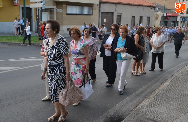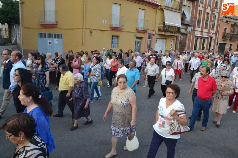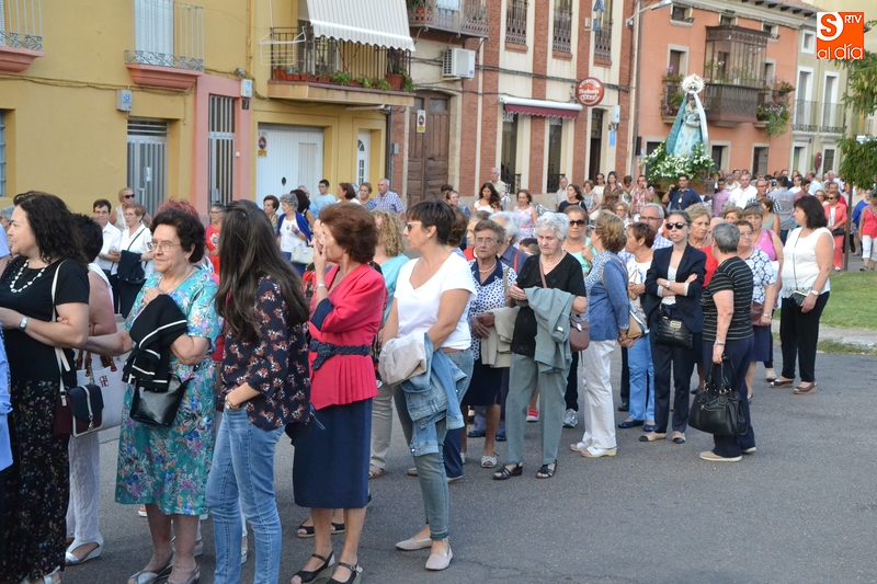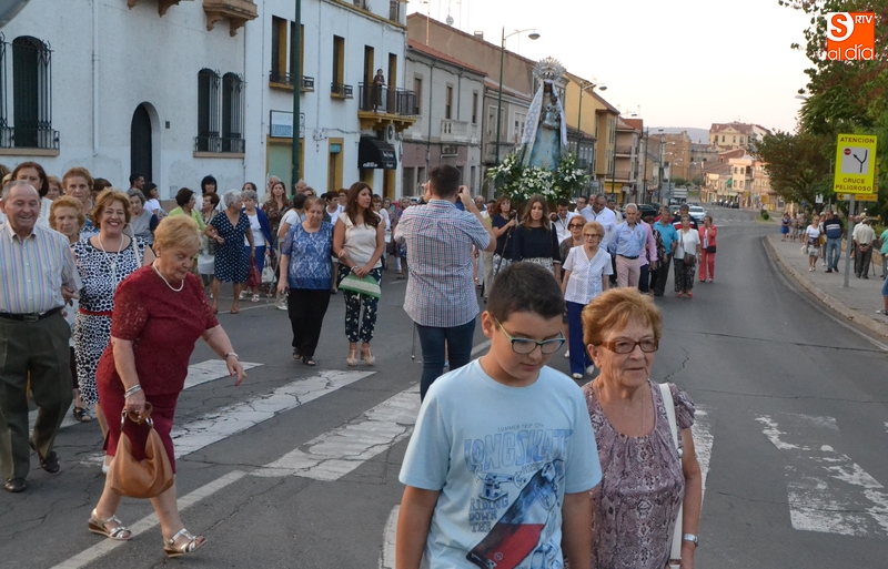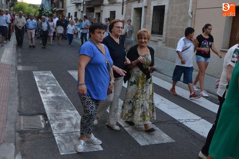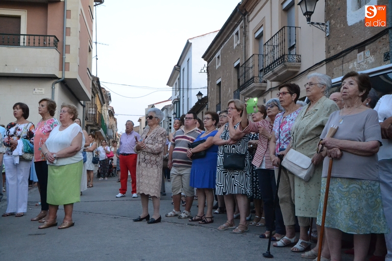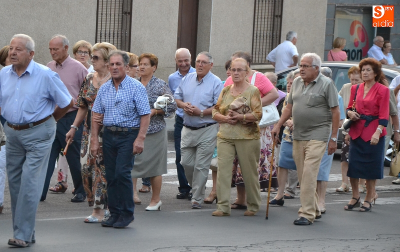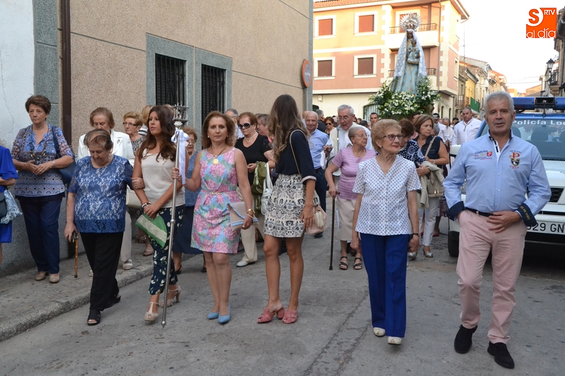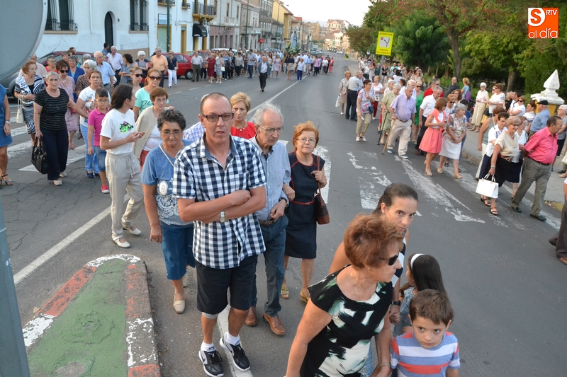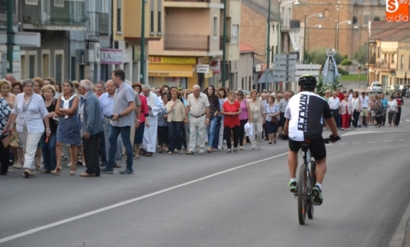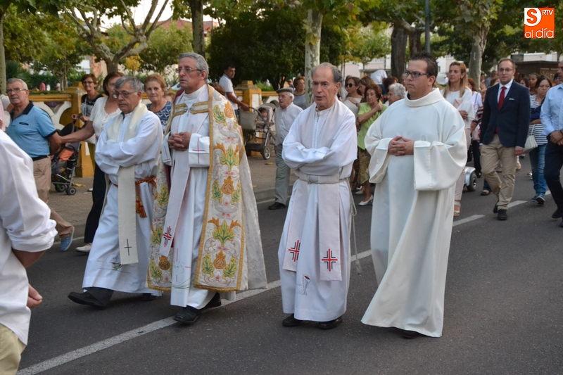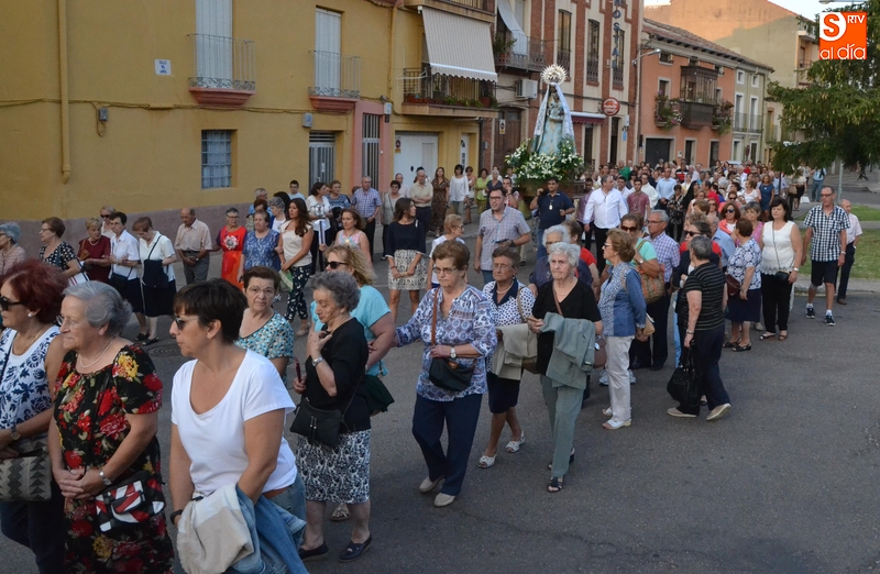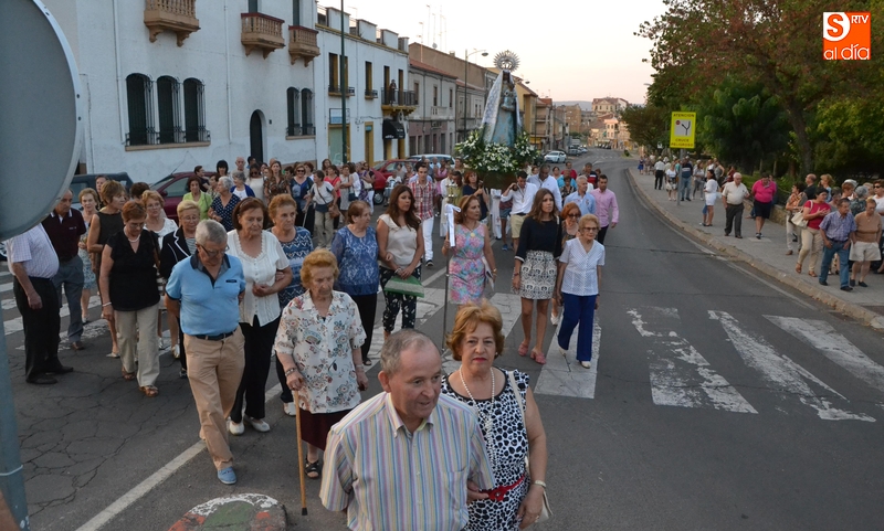 Aunque tuvieron algunos problemas de estabilidad al inicio de la procesión, fueron avanzando con la Virgen desde las puertas de la Iglesia por las calles San Antón y Canal hasta llegar a la Avenida de España, donde se vivió una situación bastante rocambolesca. Resulta que justo al ir a comenzar la procesión, uno de los agentes de la Policía Local se dirigió al párroco, Celso Martín Santos, para decirle que la procesión a su paso por la Avenida de España debía ocupar un único carril, en este caso el derecho en sentido ascendente.