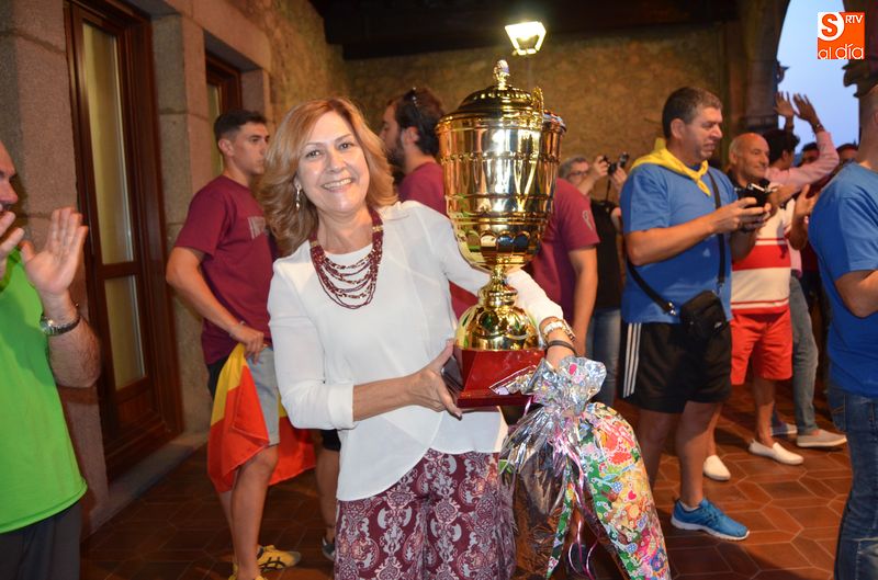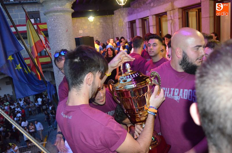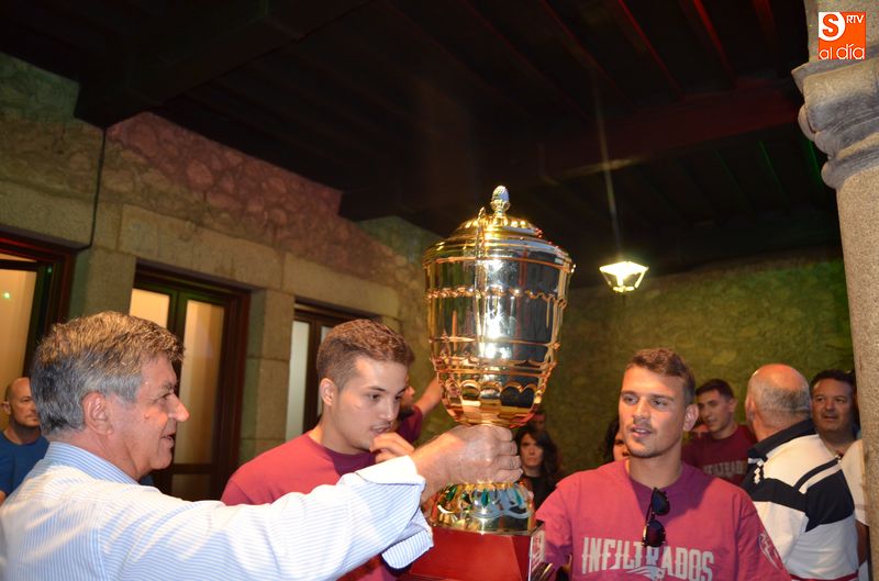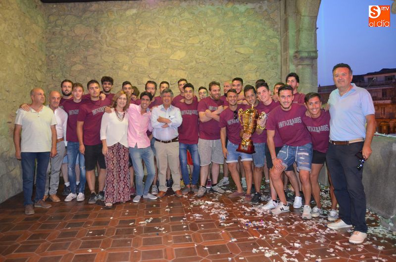El trofeo de fútbol sala ha sido entregado por el Alcalde, que después les ha regalado a todos los miembros de ambas peñas un pin con el escudo de Béjar, en recuerdo de su paso por el balcón del Ayuntamiento en este día de apertura de las Fiestas de la Virgen del Castañar.