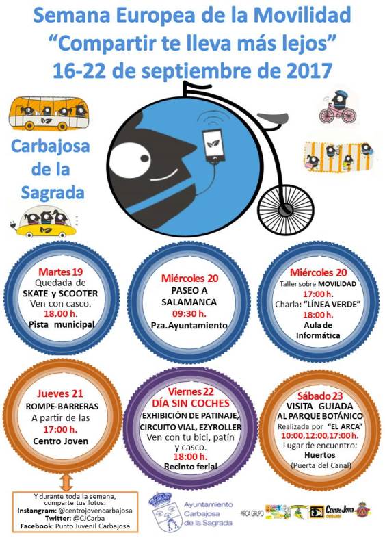 Con motivo de la Semana Europea de la Movilidad, el Ayuntamiento de Carbajosa ha organizado un extenso programa de actividades que comenzarán el próximo martes 19 de septiembre y cuyo objetivo principal es concienciar a los vecinos de la importancia de utilizar transportes sostenibles. "Compartir te lleva más lejos", según ha explicado el alcalde Pedro Samuel Martín, es el eslogan de esta semana que contempla una quedada de "skate" y "scooter", exhibiciones de patinaje y "ezyroller", y circuitos viales, entre otras actividades.