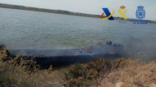 Agentes de la Policía Nacional, la Agencia Tributaria y la Guardia Civil han aprehendido 2.300 kilogramos de hachís en una operación contra el narcotráfico llevada a cabo en el río Piedras (Huelva). En la operación también se han incautado, una pistola con silenciador y un fusil de asalto. Dos personas fueron detenidas cuando los policías entraron al recinto al que se dirigieron los vehículos cargados con el hachís y uno de ellos salió del interior embistiendo a los coches policiales. Incendiaron la embarcación para que no fuera interceptada por los policías