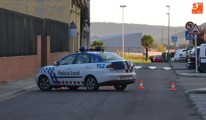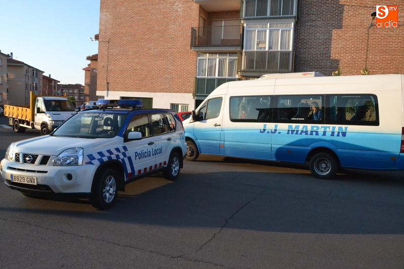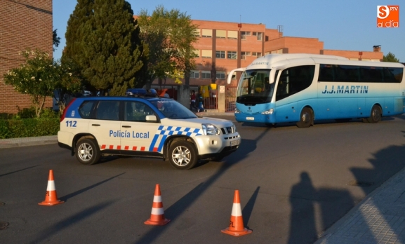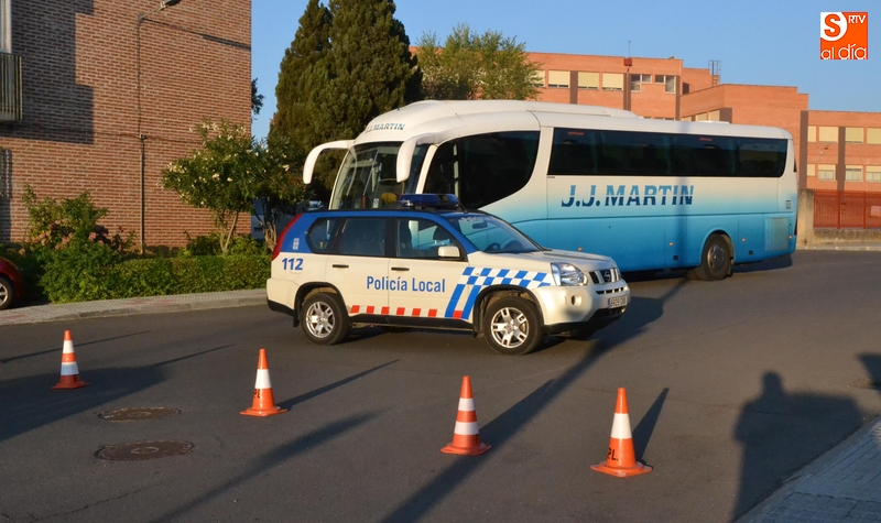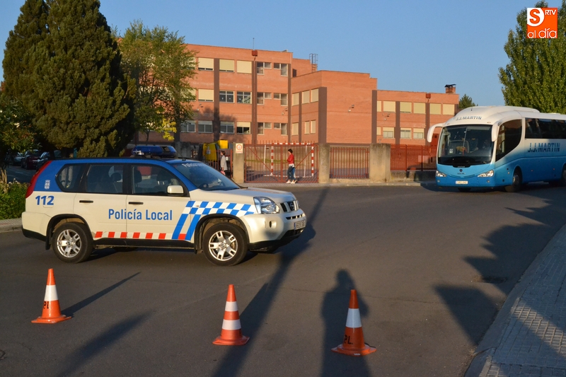 En la zona donde está la otra puerta, la que da a la calle Las Batuecas, hubo otros dos puntos. Por un lado, en la calle Peña de Francia, donde había varios conos, otro coche de la Policía Local y un agente, para retirar los conos para así permitir la salida por allí de los buses escolares tras dejar a los alumnos de transporte. En esa zona también se bloqueó, con otro vehículo y varios conos, la intersección de las calles La Alberca y Simón Vela.