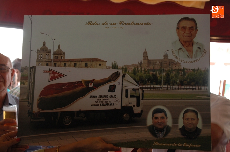 Igualmente, empleados de la empresa Jamones Pepiño, de la que fue precursor y que ahora está en manos de sus hijos Pepe y Sebastián, le hicieron también entrega de una placa en recuerdo de este día.