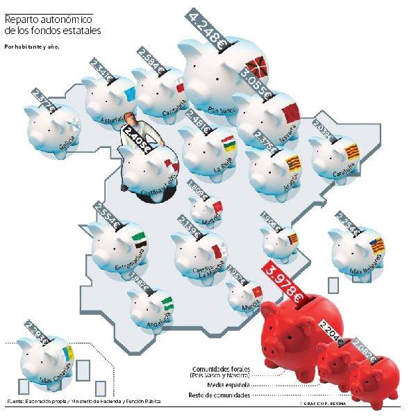 Cerrado el capítulo del País Vasco y Navarra, la financiación por habitante y año a igual cartera de competencias en el resto del territorio nacional oscila entre los 1.809 euros de Madrid, los 1.906 de Valencia, los 1.957 de Murcia o los 1.987 de Andalucía y los 2.481 de La Rioja, los 2.554 de Extremadura o los 2.584 de Cantabria. Castilla y León habría recibido en 2014, según los datos del Ministerio de Hacienda, 2.405 euros por empadronado.