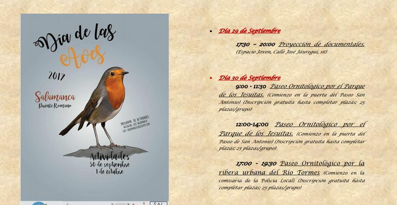Mañana sábado, 30 de septiembre, las actividades comenzarán con un paseo ornitológico por el Parque de los Jesuitas, desde la Puerta del Paseo de San Antonio. Se celebrarán dos sesiones: a las 9,00 y a las 12,00 horas, en grupos de 25 personas.
