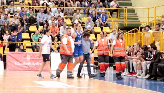 Laura Gil cayó lesionada en el primer cuarto del encuentro de este mediodía ante Spar Citylift UniGirona, fruto de una acción fortuita en la defensa de una penetración a canasta rival.