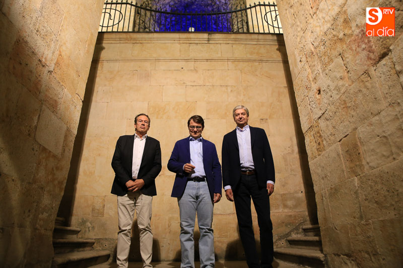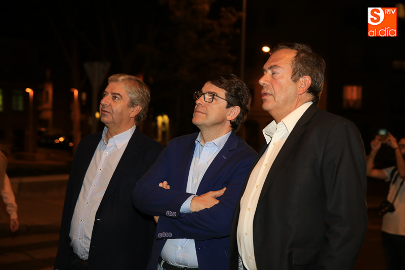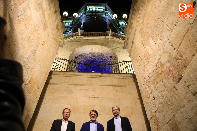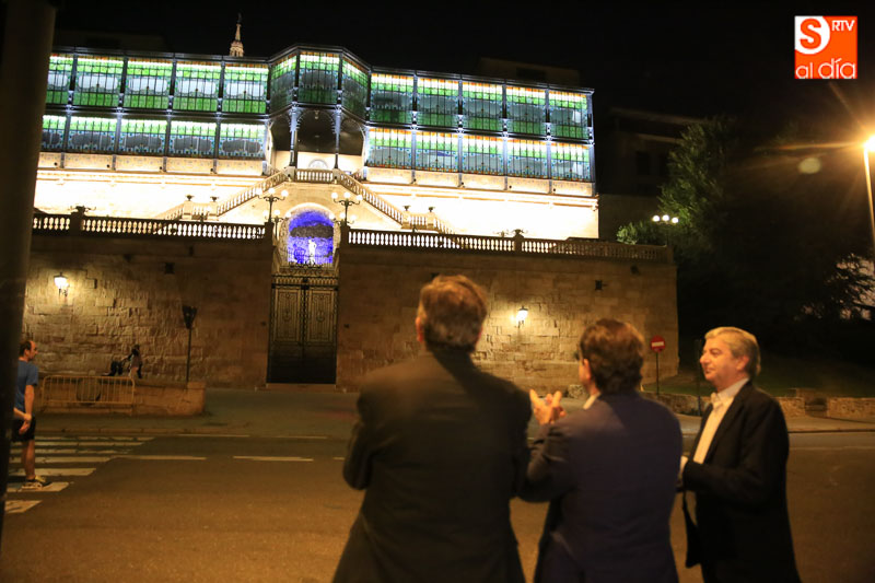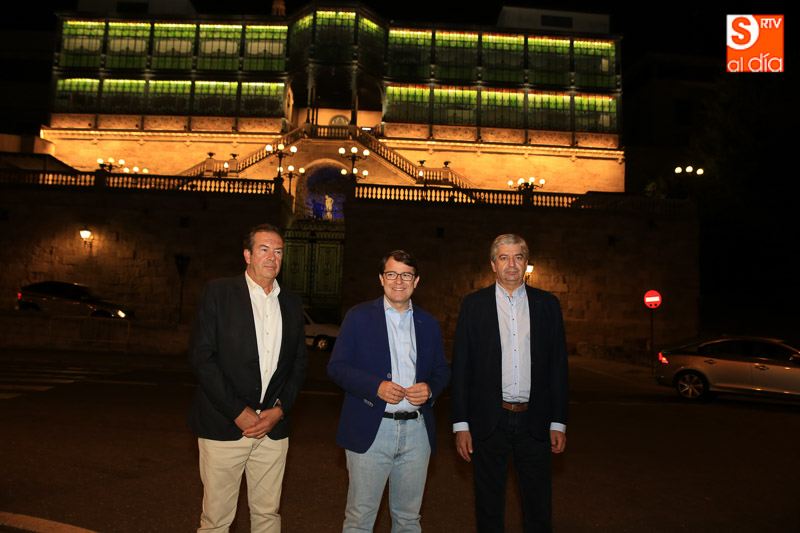 El alcalde de Salamanca, Alfonso Fernández Mañueco, acompañado del director del Museo Art Nouveau y Art Déco, Pedro Pérez Castro, ha asistido a la puesta en marcha de la nueva iluminación que se ha centrado en las vidrieras, los pilares de fundición de hierro, los paños de la fachada, la escalinata y el vestíbulo en forma de pórtico.