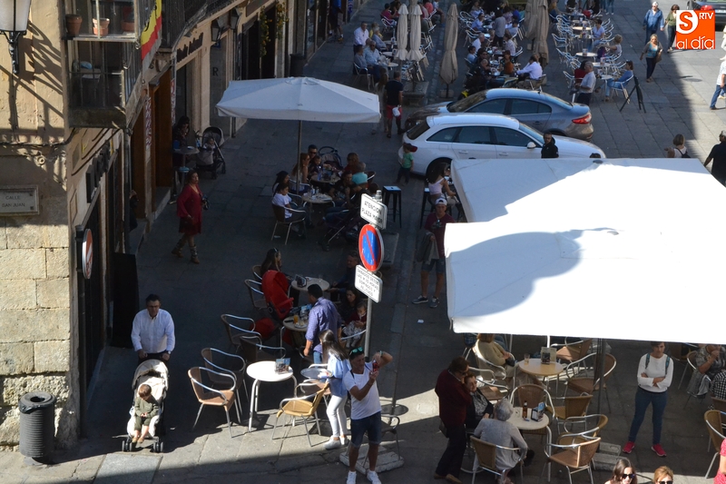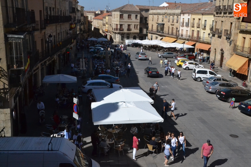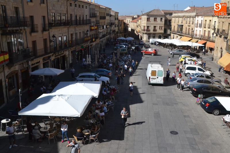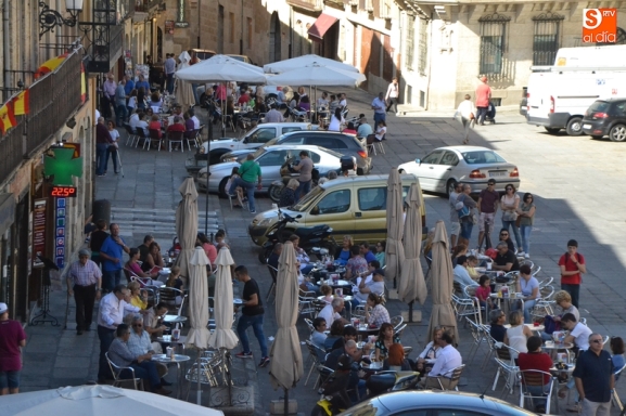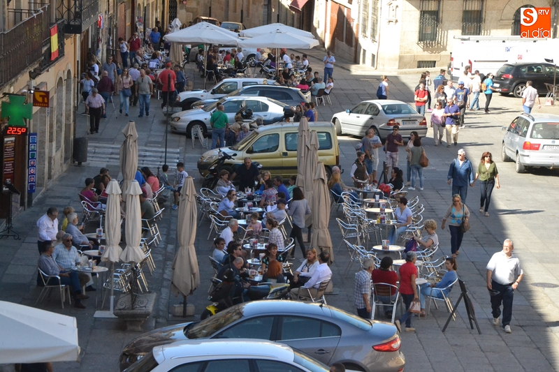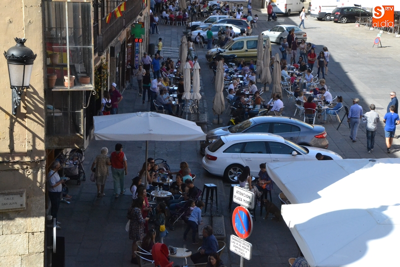 Hay que recordar que el Ayuntamiento permitió a los establecimientos de hostelería de la Plaza Mayor tener desplegadas sus terrazas durante toda la jornada del viernes, limitándose los vehículos a aparcar en los espacios no ocupados por terrazas, y sólo durante el horario laboral.