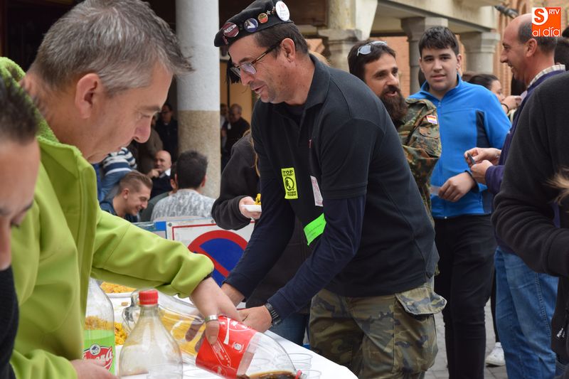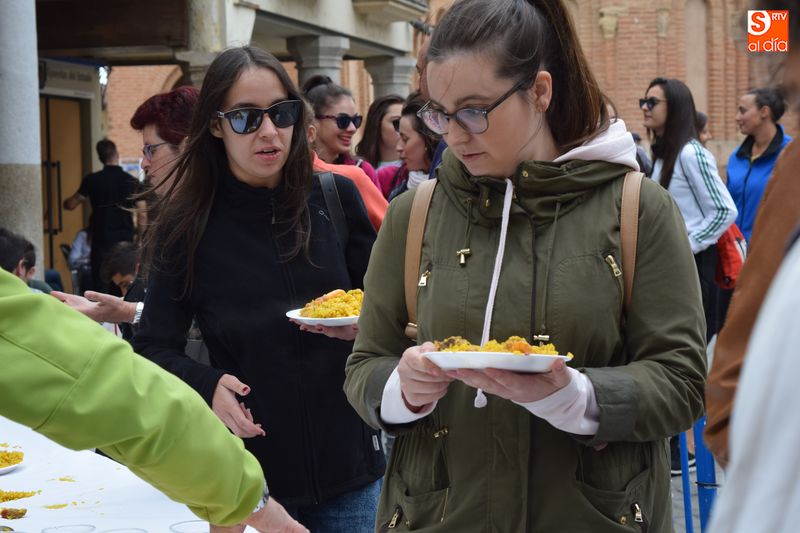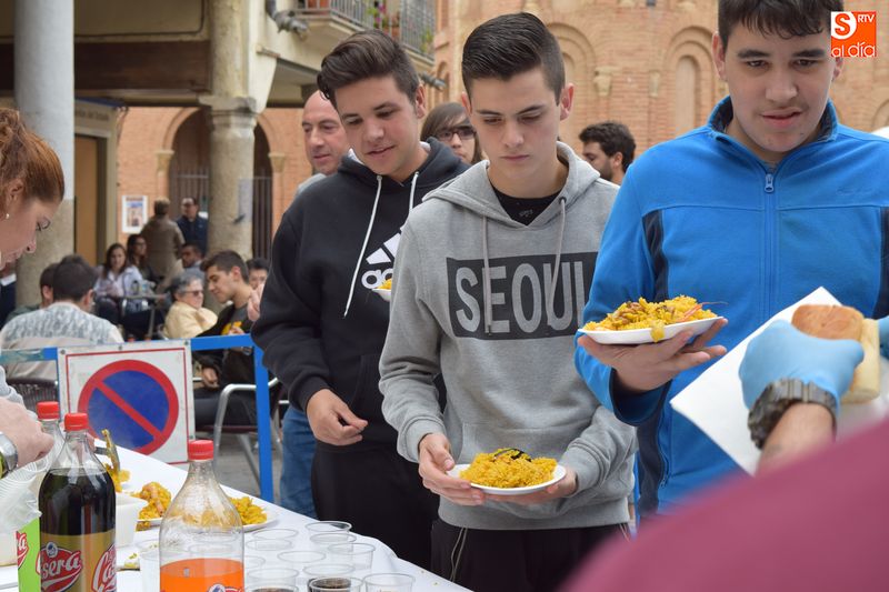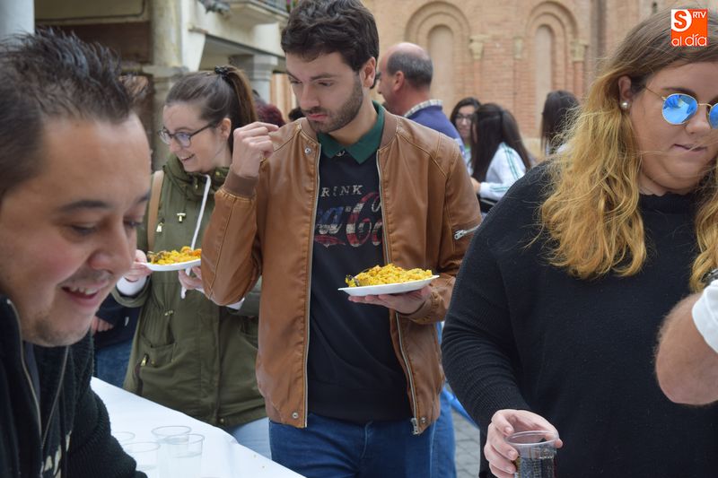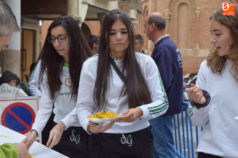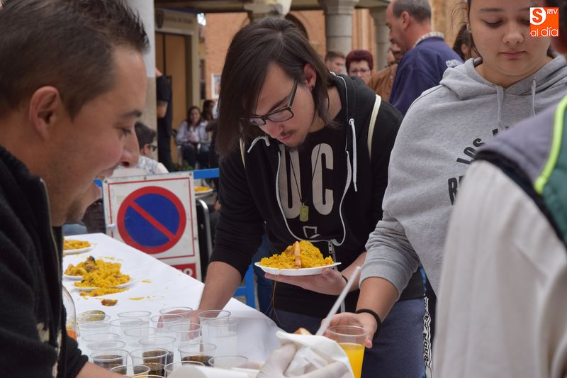 Las peñas se congregaron este mediodía en la Plaza Mayor para disfrutar de una multitudinaria paella. Se repartieron en torno a 250 raciones de paella con el objetivo de reponer fuerzas para seguir disfrutando de lo que resta de actos festivos.